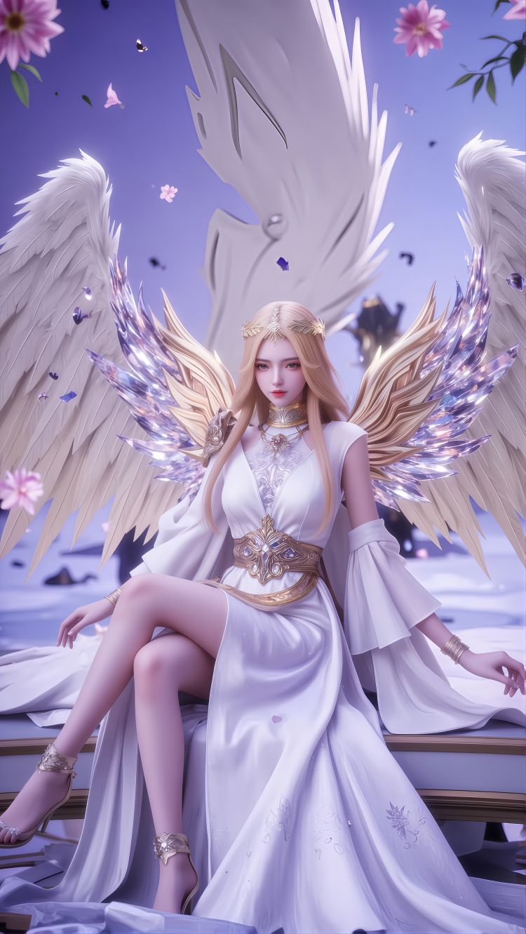1Overall Character: A blonde girl with exquisite hair accessories and gorgeous costumes, with a delicate and realistic 3D Chinese animation style. The character poses in various ways, whether fighting or resting, with rich shooting angles and expressions that change with the situation. Her hairstyle is soft and elegant, and her movements include casting techniques, holding a staff, etc. Her clothing is a white long dress decorated with gold, paired with huge wings, and her makeup is exquisite. The background is a fantasy dark purple space, with excellent picture quality and full details.
