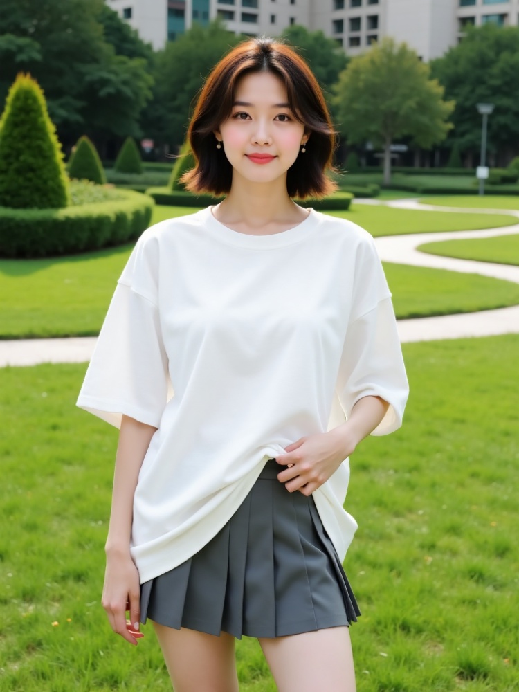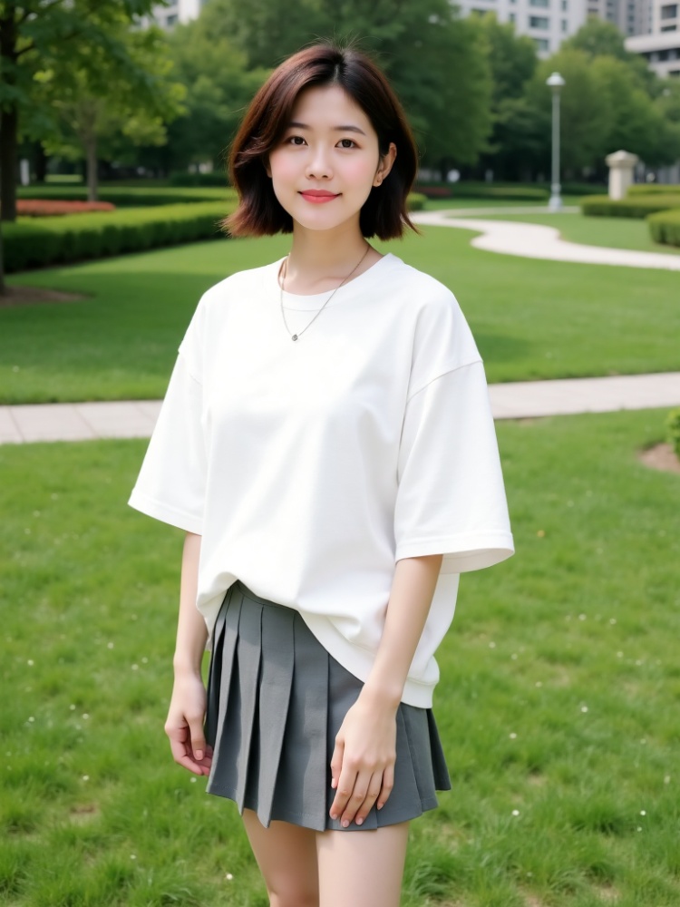 A 29-year-old young woman in casual clothes, with short hair, wearing a white, ultra-loose and oversized short-sleeved T-shirt (one sleeve long and the other side is short) and a gray pleated short skirt, standing on the lush green grass in the park, with neatly trimmed green plants, winding paths and distant buildings, creating a fresh and fashionable outdoor atmosphere.