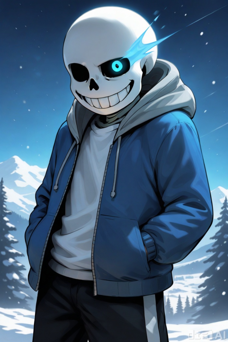 white shirt, blue jacket, black shorts, white socks, pink slippers,hood down,open jacket,white hood,skeleton,smile,open mouth,teeth,male focus,black sclera,white eyes,hoodie,1 boy,solo,white gloves,grin