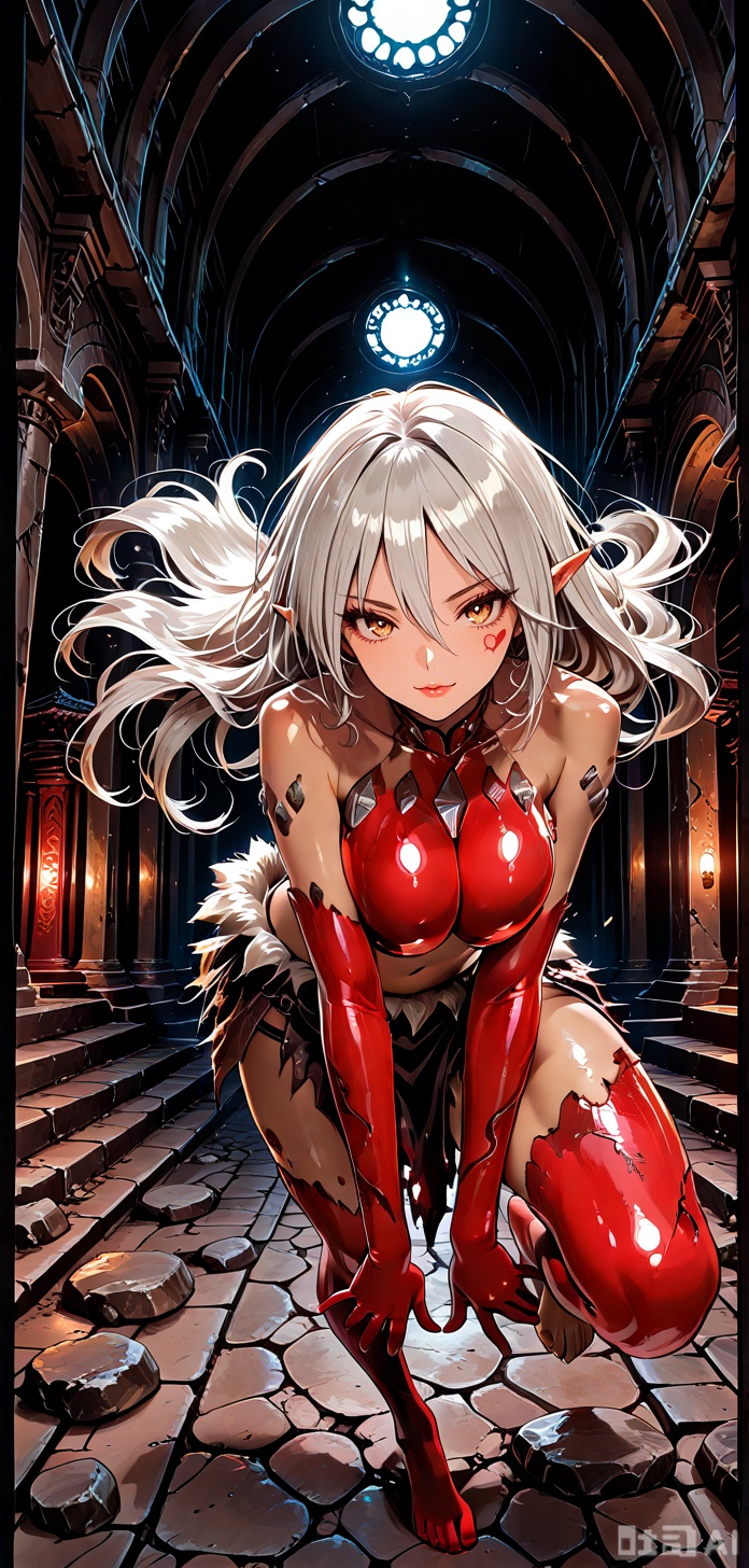 GHOULMGE,ghoulmge, monster girl, pointy ears, fang, red legs, red arms, red breasts, red paint, facial mark, rock patches,Long hair, grey hair, barefoot, dark skin, dark-skinned female,loincloth, torn clothing, fur trim, navel,