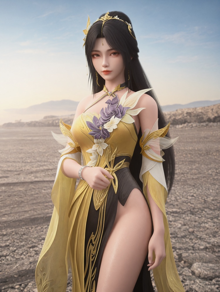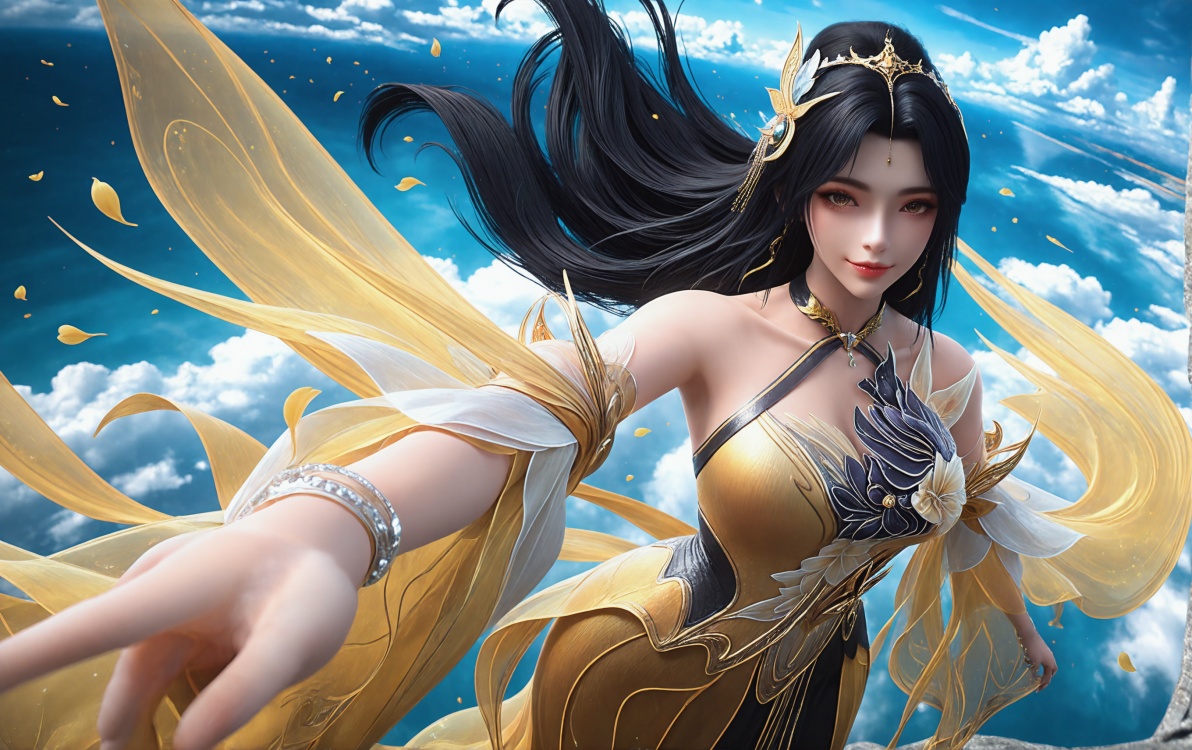 wangxi, 1girl, black hair, long hair, bare shoulders, hair_ornament, jewelry, chinese_style, evening_gown,long_skirt,wide_sleeves,