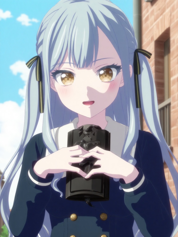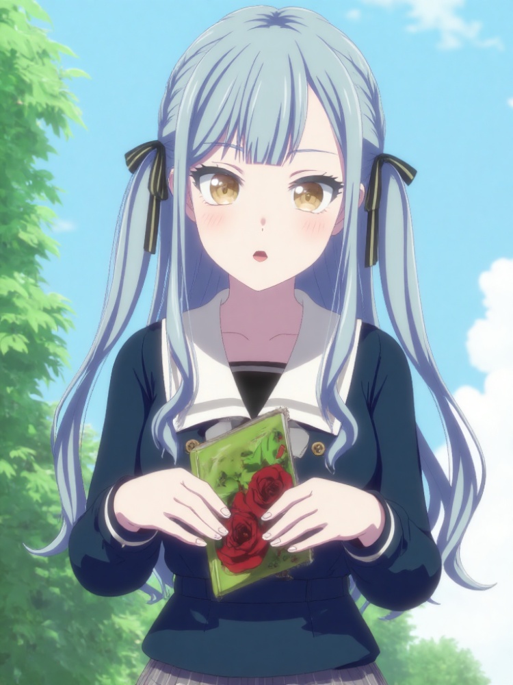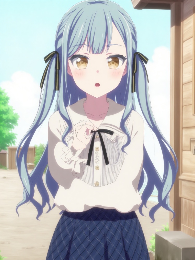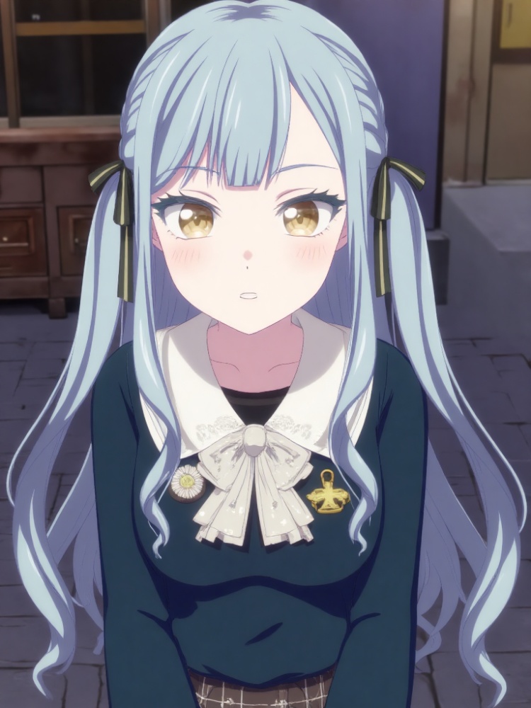 主体:togawa sakiko,bangs,ribbon,hair ribbon,black ribbon,two side up,blue hair,grey hair,sidelocks,blunt bangs,yellow eyes
