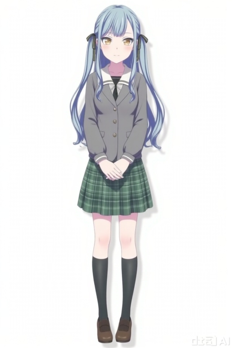 月之森:Tsukinomori school uniform,serafuku,bowtie,sailor collar,navy blue plaid skirt,double-breasted,dress,navy blue pleated skirt,neckerchief,kneehighs,brown footwear,black socks,loafers,white sailor collar,blue neckerchief, navy blue school uniform with a white collar