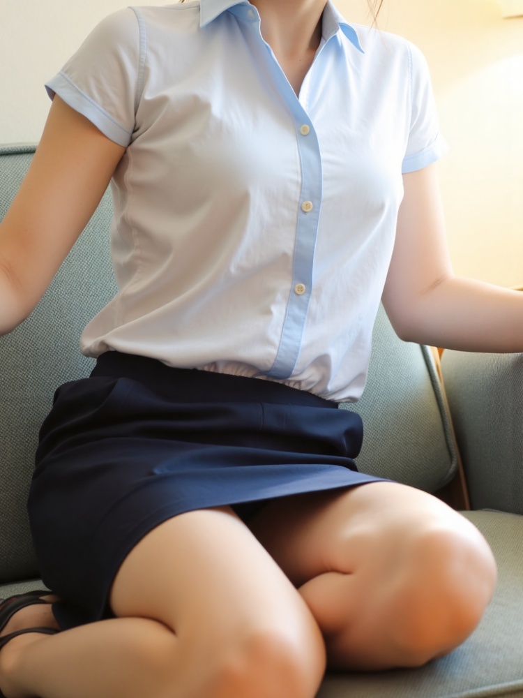 1girl,Black pencil skirt,Light blue collared shirt,black pantyhose,sitting,Sofa,White collared shirt,blue pencil skirt,White bra with black trim,Black lace bra, black lace panties ,skirt lift,Black women's safety pants,Off-the-shoulder,lying in bed