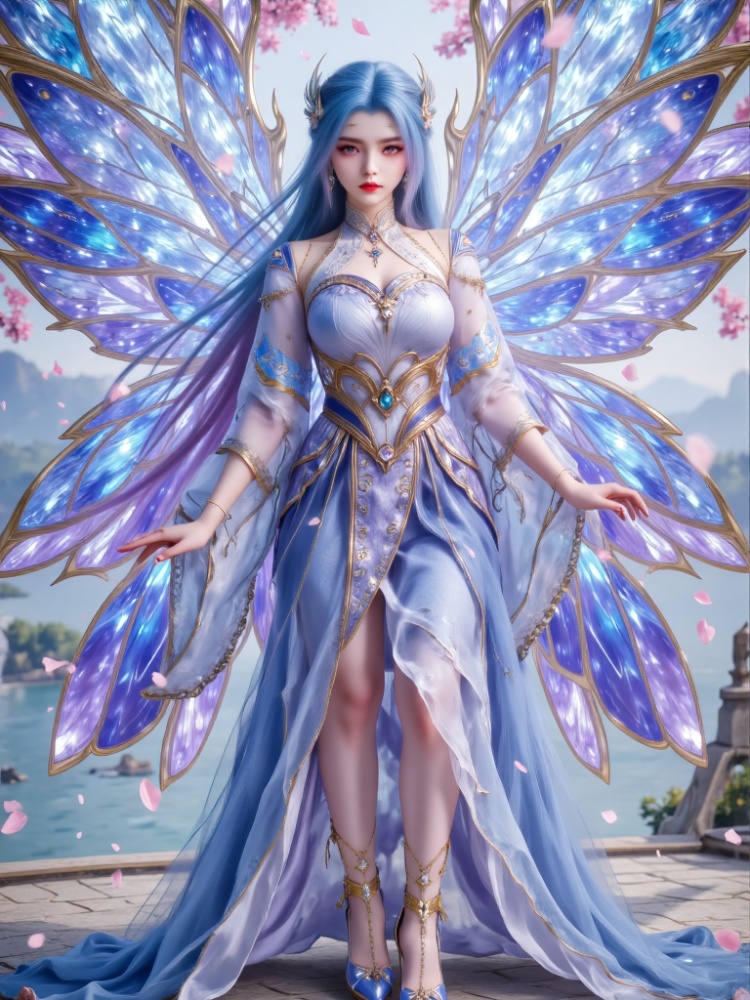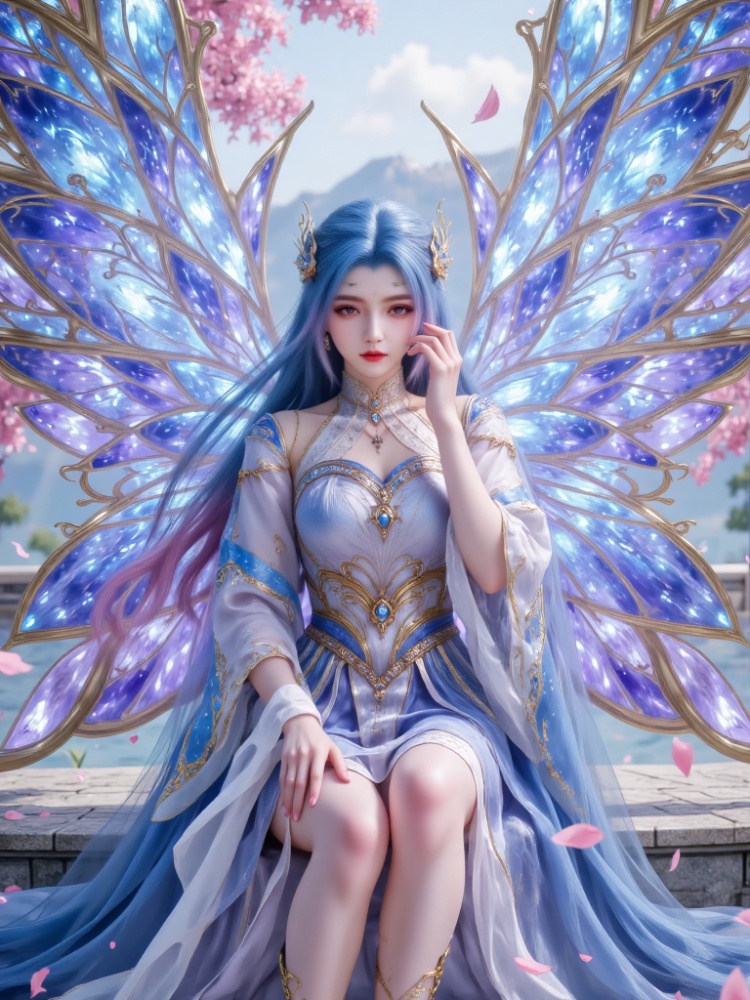 -Hairstyle: She has flowing blue hair that is soft and shiny. She wears delicate golden hair accessories on her head, resembling wings or vines, adding a sense of fantasy. ​ -Makeup: The makeup is delicate and delicate. The red eye shadow is used for eye makeup, with long eyelashes, so that the eyes look very smart; Her lip makeup is red, and the overall makeup highlights her elegant and slightly cool temperament. ​ -Clothing: Wear clothing that combines ancient style and fantasy elements, with blue and white as the main colors and gold decorations. The clothing style features a waist cinching design, highlighting the curves of the figure. The sleeves are made of transparent gauze material and decorated with blue and gold patterns; The skirt has rich layers, and some styles have slit designs, adding a touch of charm when walking. ​ -Decoration: In addition to hair accessories, she also wears multiple pieces of jewelry on her body, including a necklace around her neck with gemstones and exquisite pendants; There is a gold chain decoration at the ankle, which echoes the decoration on the shoes. The shoes are blue high heels with gold decoration, exquisitely designed. ​ -Wings: Behind them are huge and magnificent wings, with a blue purple gradient effect on the main body of the wings. There are gold patterns and decorations on top, like glass or crystal materials, which shimmer under the illumination of light. The wings have complex and layered shapes, which are a major highlight of the picture. ​ -Character postures and movements: There are various postures, such as sitting upright, standing, sideways, etc. The movements are elegant and natural, such as lifting hands lightly, lightly touching hair with fingers, etc., showing a gentle and serene temperament. ​ -Shooting perspective and composition: Often adopt a frontal or slightly lateral perspective, with the characters occupying the main position in the composition, and the background serving as a backdrop, allowing the audience's attention to focus on the characters. ​ -Facial expression: The expression is relatively calm, with eyes either looking straight ahead or slightly thoughtful, giving an overall feeling of calmness and composure. ​ -Background: The background is often a scene with pink cherry blossom trees, lakes, distant mountains, or classical architectural elements, with petals falling, creating a beautiful and dreamlike atmosphere. ​ -Painting style and image quality: The painting style belongs to the realistic style of fantasy illustration, with delicate image quality, bright colors and natural transitions. Whether it is the texture of the characters' skin, the texture of clothing, or the luster of the wings, they are all portrayed very realistically, with rich details.