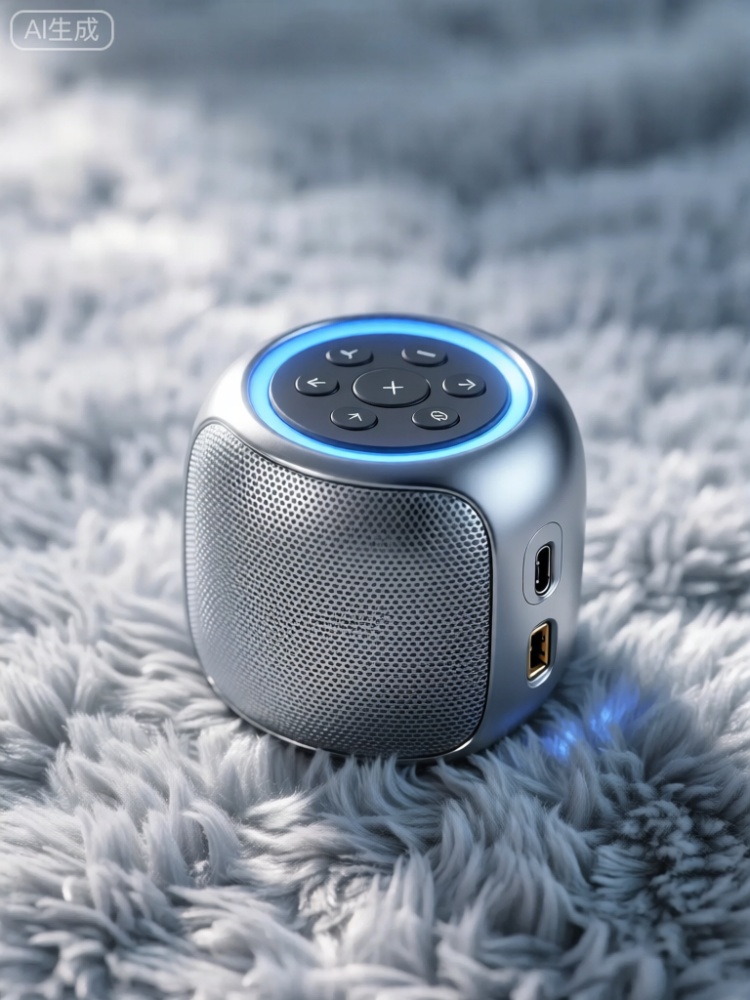 CYCJ,该图像的特写是一款便携式蓝牙音箱的银色金属网格外壳,在柔软的毛绒地毯背景上显得科技感十足。毛绒地毯为浅灰色,绒毛浓密而柔软,在光线的照耀下,呈现出柔和的光泽,给人一种温馨舒适的感觉。蓝牙音箱的外壳采用银色金属网格设计,网格细密而均匀,能够有效地保护内部的扬声器,同时又不影响声音的传播。音箱的顶部有一个圆形的控制面板,面板上分布着几个触摸按键,用于调节音量、切换歌曲等操作。控制面板周围有一圈蓝色的LED指示灯,在音箱工作时能够发出柔和的蓝光,增添了一份科技氛围。在音箱的侧面,有一个USB接口和一个音频输入接口,方便用户连接其他设备。整体构图强调了蓝牙音箱的现代感和便携性,与毛绒地毯的柔软质感形成鲜明对比,营造出一种既时尚又温馨的氛围。照明采用了漫反射光线,使音箱的金属光泽和毛绒地毯的柔和质感都得到了很好的展现。
