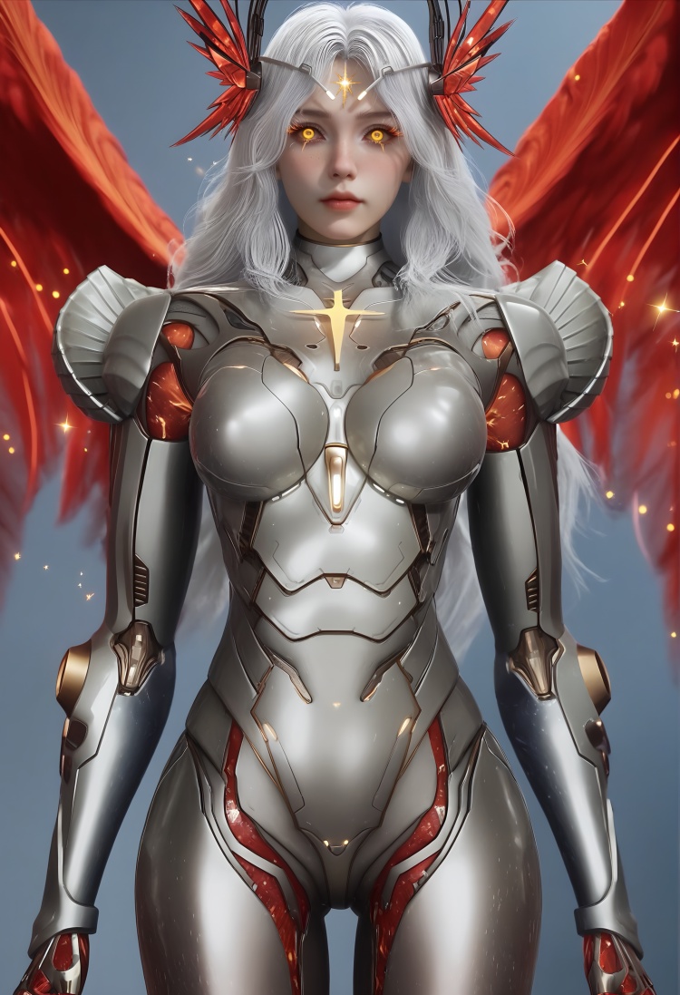 Metallic horn-like ornament,blending feathers and mechanical parts,------注释----头脸power armor,shoulder armor,wings,feathered wings,red wings,large_wings,--------注释----上半身cybernetic leg,long legs,bare legs,cybernetic leg,red veins,-------注释----下半身mature_female,