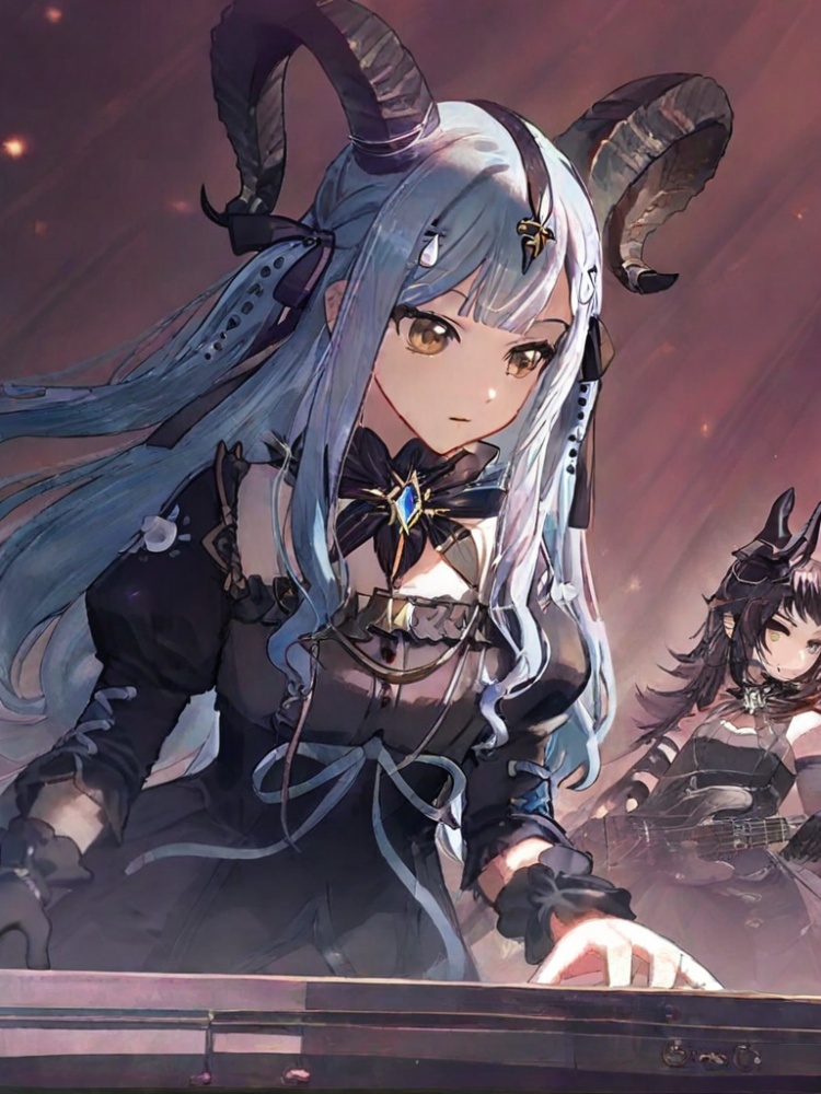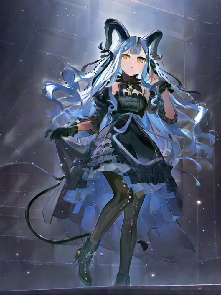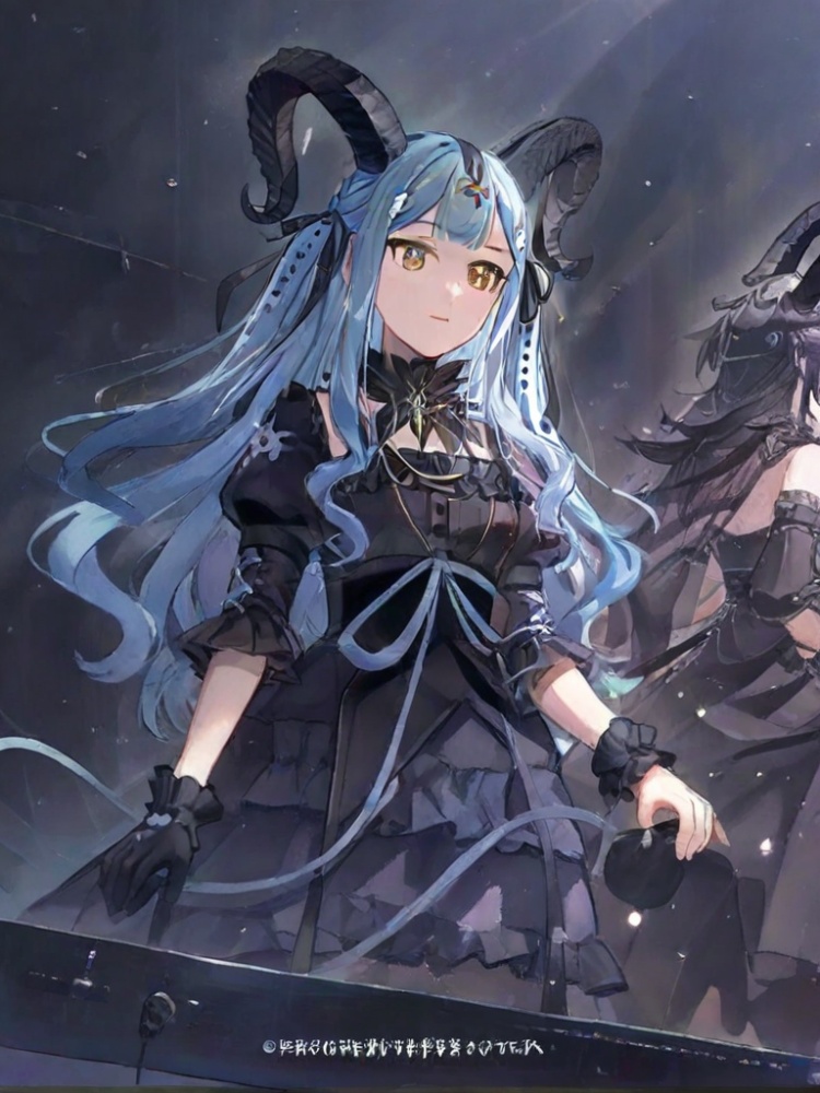 togawa sakiko,bangs,ribbon,hair ribbon,black ribbon,two side up,blue hair,grey hair,sidelocks,blunt bangs,yellow eyes,long hair,wavy hair,shirt, gloves,dress,pantyhose,boots,black gloves,black footwear,high heels,black pantyhose,thighhighs, dress,tail, horns, black dress,hair ornament,