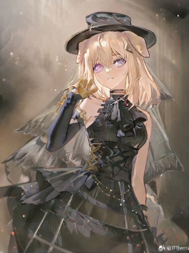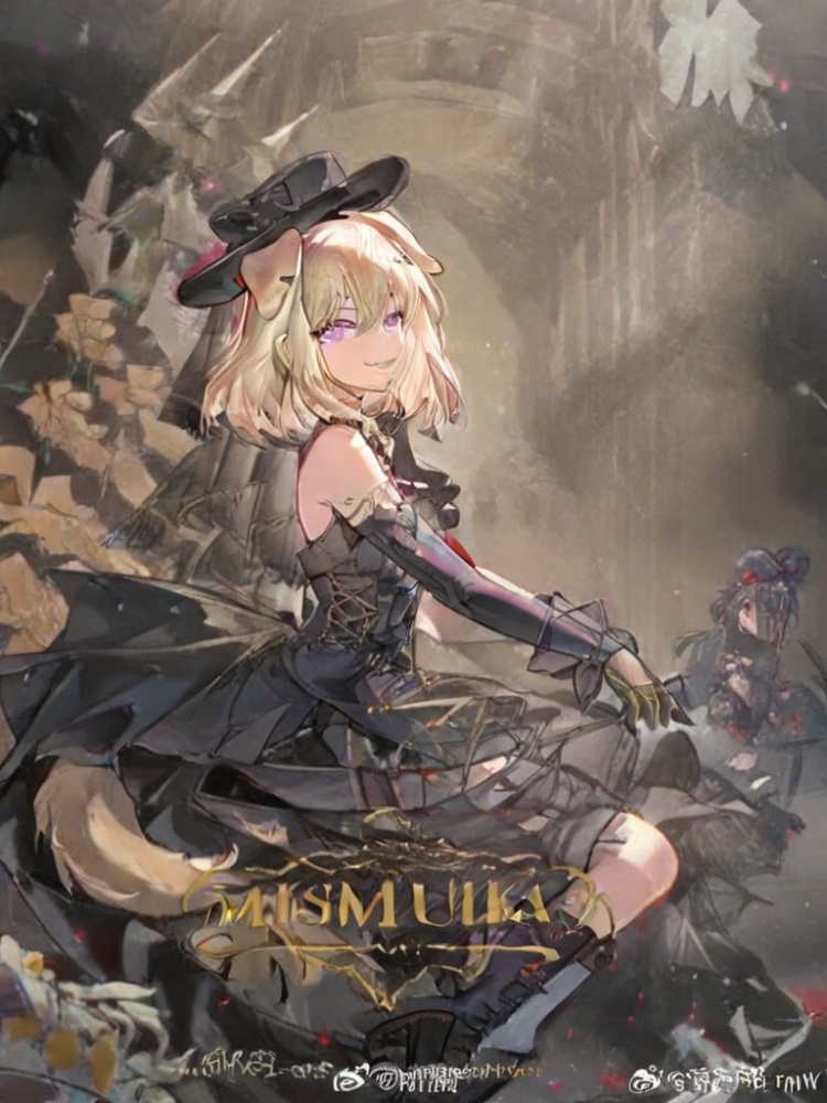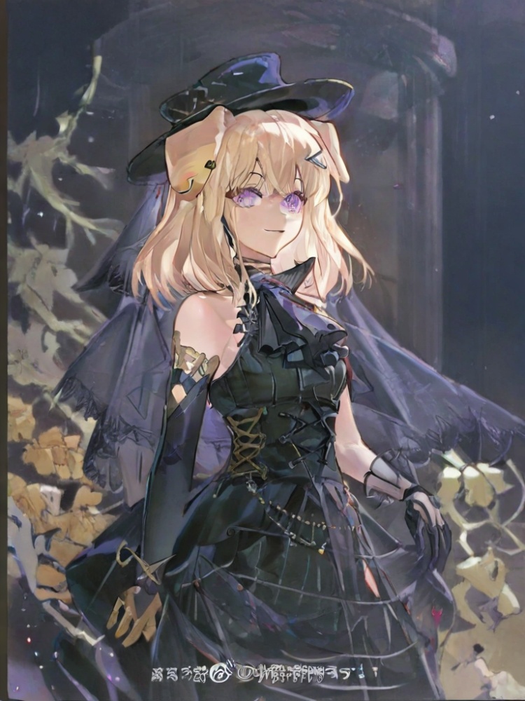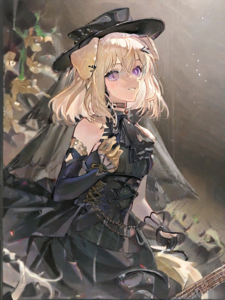 8> Misumi Uika,blonde hair bangs,purple eyes,smile,medium hair,hair between eyes,gloves,hat,dress, animal ears, bare shoulders, flower, boots, black gloves,black footwear, black dress, high heels, black headwear,hair ornament,sleeveless,elbow gloves,dog ears,sleeveless dress