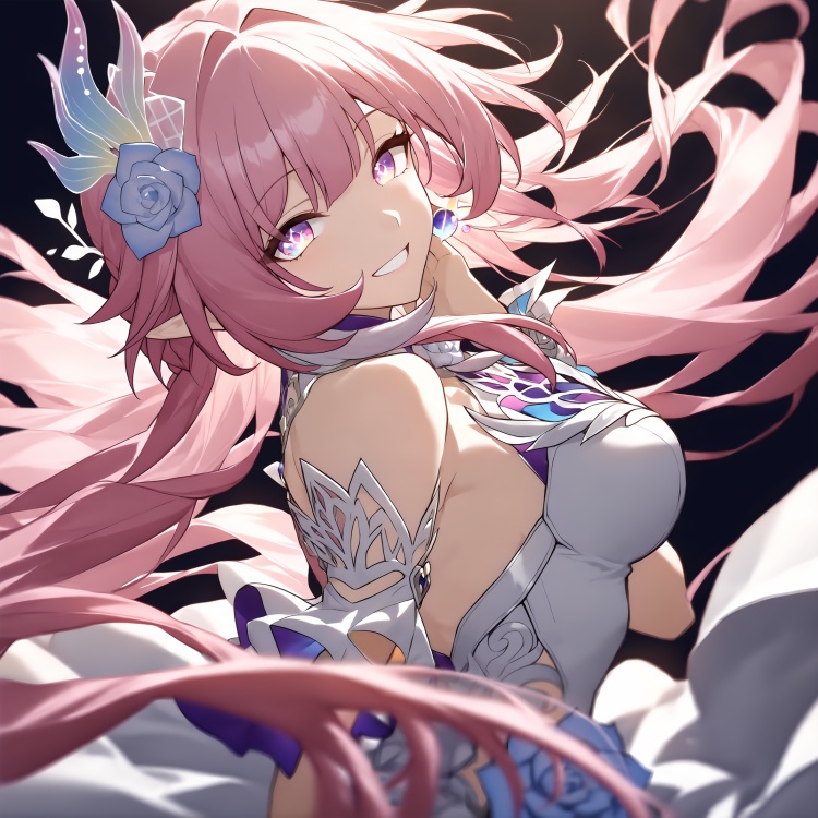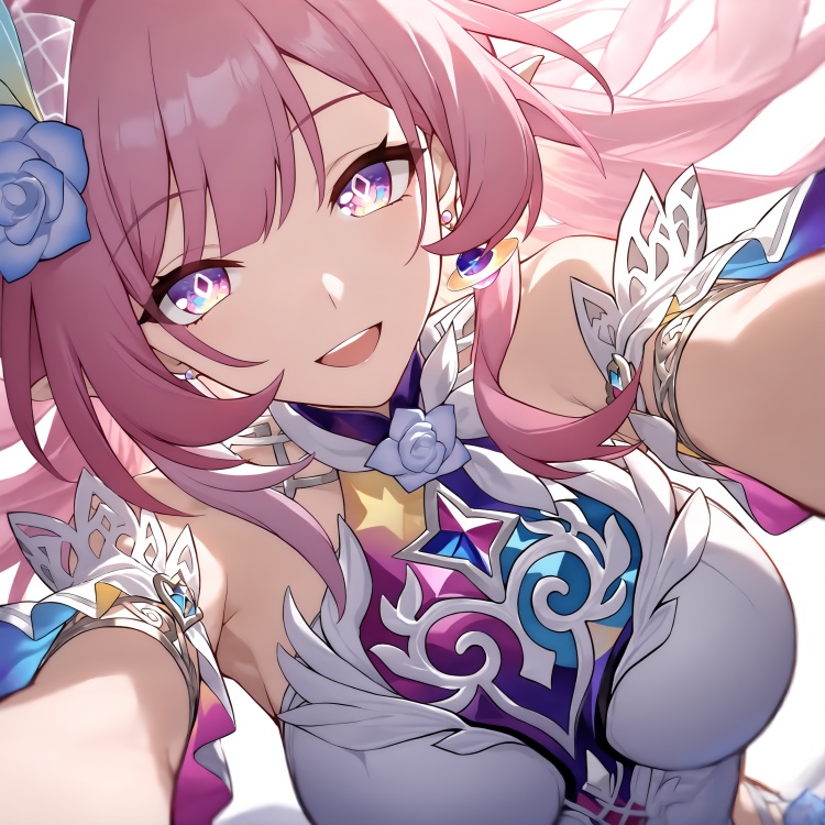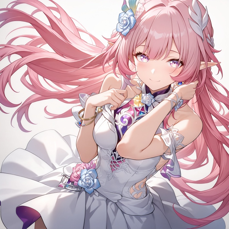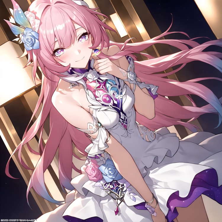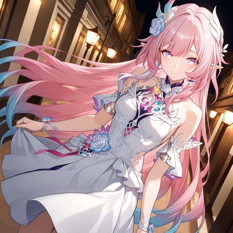 (masterpiece, best quality, very aesthetic), Cyrene, 1girl, long hair, gradient hair, solo, white dress, looking at viewer, hair ornament, white dress, sleeveless dress, cute, playful, romantic, love, dynamic angle,