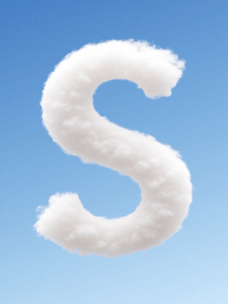 This image is a high-resolution photograph featuring a large, three-dimensional letter "S" formed by fluffy white clouds against a clear blue sky. The clouds are dense and soft, giving them a texture similar to cotton or wool, with light shading indicating depth. The letter "S" stands out prominently against the sky, which has a gradient of blue, ranging from a lighter hue at the top to a darker shade near the bottom, suggesting the presence of an upper atmosphere. The clouds forming the letter are voluminous, filling the letter with a fullness that contrasts with the thin, clear sky. The photograph is taken from a distance, ensuring the clouds appear soft and fluffy without any sharp edges. There are no other objects, people, or additional elements in the image, focusing entirely on the letter and the sky, emphasizing simplicity and clarity. The style is realistic and minimalistic, emphasizing the natural beauty of clouds against a serene sky.