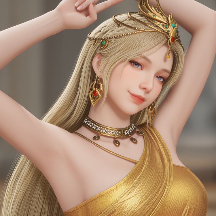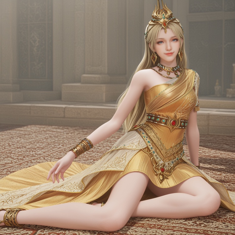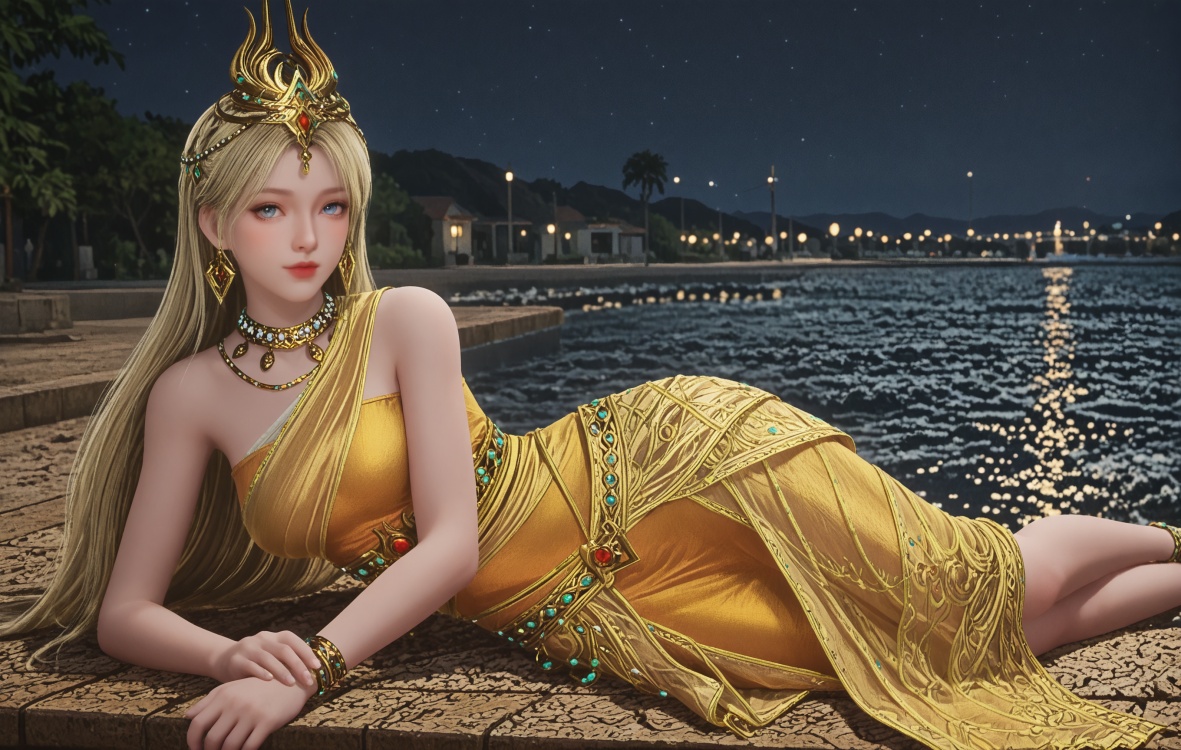 1girl,blonde hair,long hair,hair_ornament,jewelry,blue eyes,yellow dress,layered_dress,long_skirt,