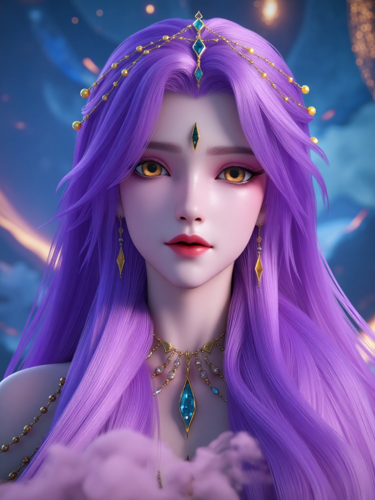 Core characteristics of the character: -Hairstyle: A flowing purple long hair with delicate and dynamic texture, paired with exquisite hair accessories - decorated with golden bead chains and gemstones, adding a sense of luxury and mystery. -Makeup and special features: the makeup is exquisite and charming, and the eye makeup is mainly warm, with natural powder blusher; A golden vertical eye on the forehead is a prominent special feature; The bright red lips and overall makeup highlight the mysterious and eerie temperament of the character. -Clothing: Dressed in a fantasy style of clothing, the style combines flowing yarn and gold decorations, with some clothing featuring three-dimensional patterns and tassel designs, exquisite and layered; The clothing is mostly off the shoulder and slim fitting styles, paired with slit skirts, showcasing slender leg lines and delicate and realistic skin texture. -Attitude and perspective: -The characters have diverse postures, including frontal gaze, sideways glance, standing and casting spells, presenting emotions that are either mysterious or slightly majestic; The shooting angles are rich, including close-up shots, overhead shots, and overhead shots, which showcase the appearance, clothing details, and posture of the characters from multiple angles. For example, close-up shots highlight the three eye features and makeup of the face, while overhead shots showcase the overall luxury of the design. -The delicate expression, with a mysterious gaze and focused casting, conveys different emotional atmospheres, making the character image more storytelling. -Background and image quality: -The background is a fantasy style scene, featuring starry skies, secret realms, and environments with magical effects. The colors are mainly blue, purple, and gold, embellished with glowing particles, magic arrays, or fantasy creatures, creating a mysterious and dreamlike atmosphere; The image quality is delicate, and the details of the 3D modeling are clear and visible. From the texture of hair, the wrinkles of clothing to the lighting effects of the background, all *********** high-level production. The color rendering is rich and layered, with purple and gold as the main colors throughout, creating a unified and beautiful visual style. -Composition and Painting Style: -Composition emphasizes the integration of characters and backgrounds, creating a dynamic image through the combination of character postures and background elements such as magic effects and starry sky; The art style belongs to the realistic fantasy art creation, combining delicate character shaping and mysterious scene design, presenting a cinematic visual texture as a whole. Each picture is like a shot in a fantasy story, full of artistic sense and imagination.
