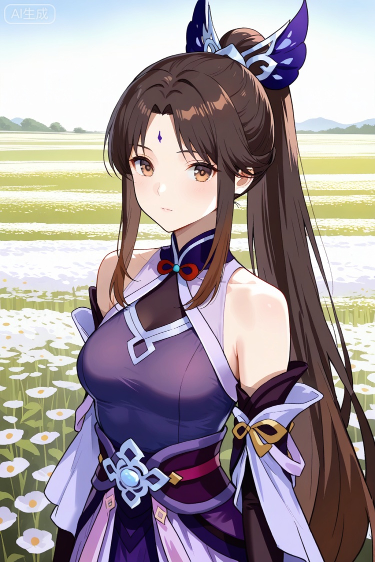 夏凝裳,best quality,amazing quality,1girl, solo, black hair, brown hair, very long hair, ponytail, sidelocks, brown eyes, bangs, parted bangs,purple dress, purple skirt, hair ornament, forehead mark, gloves, elbow gloves, black gloves, bare shoulders, detached sleeves, long sleeves, sleeveless,