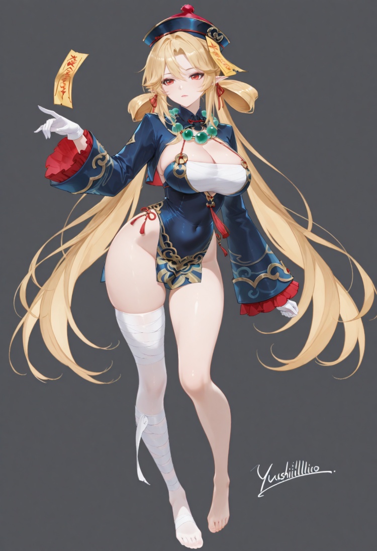 触发词:xiwang,1girl,long hair,bangs,blonde hair,red eyes,hat,ribbon,hair ribbon,pointy ears,red ribbon,ofuda,talisman,breasts,cleavage,jewelry,necklace,hair rings,beads,jiangshi,bead necklace,qing guanmao,large breasts,thighhighs,gloves,long sleeves,dress,very long hair,jacket,white gloves,white thighhighs,hat,barefoot,pointy ears,wide sleeves,bandages,single thighhigh,bandaged leg,jiangshi,