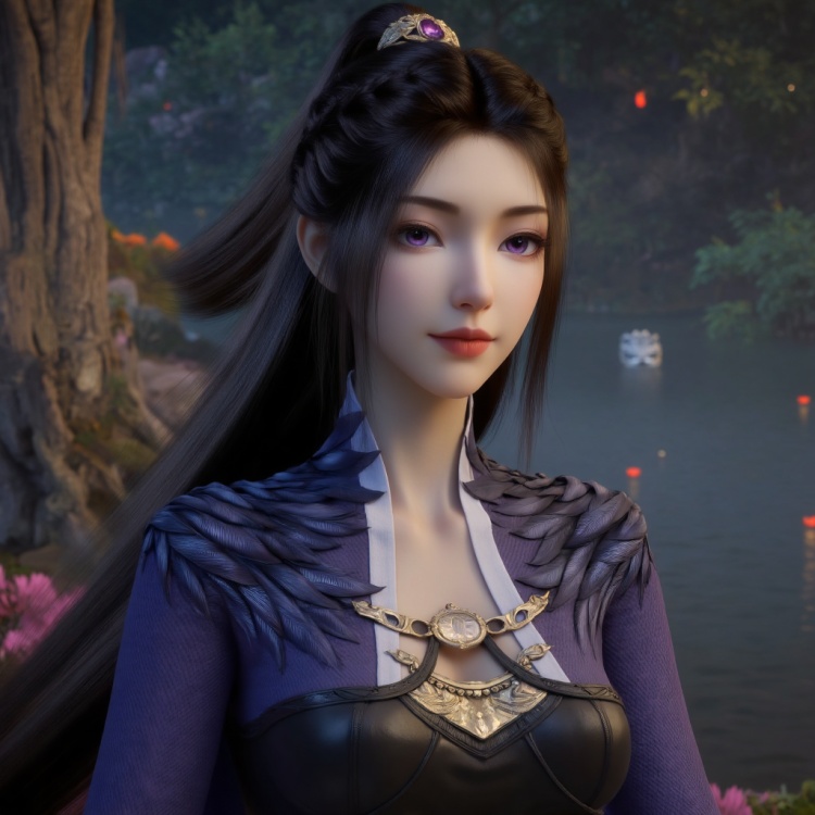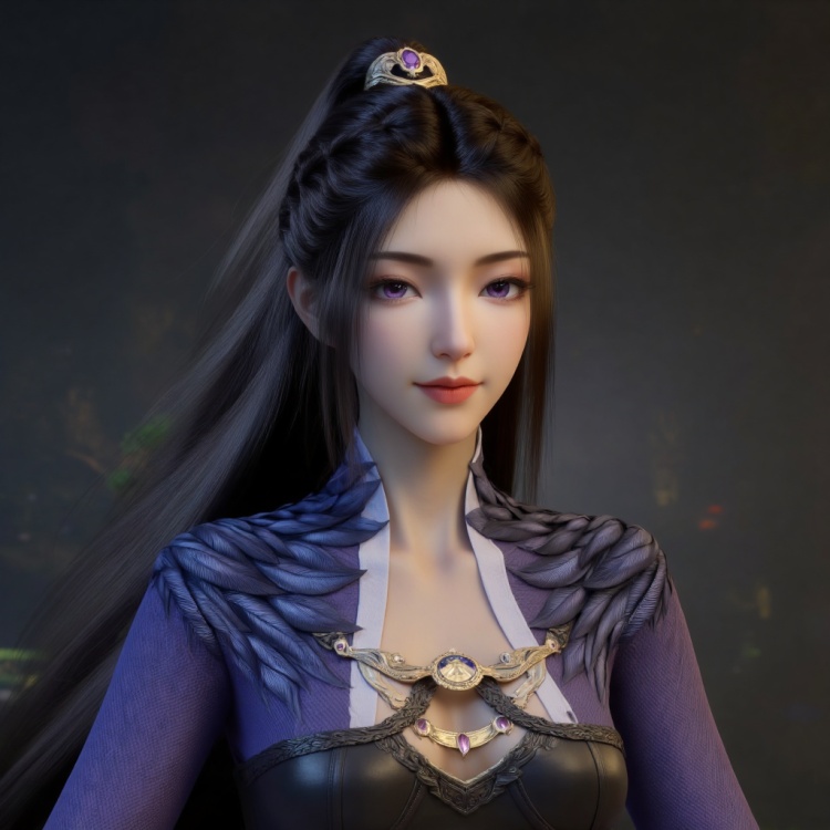 1girl,black hair,purple eyes,long Hair, brown hair,upper body,masterpiece ,bestquality,dress,braid hair bun,mouth evil,