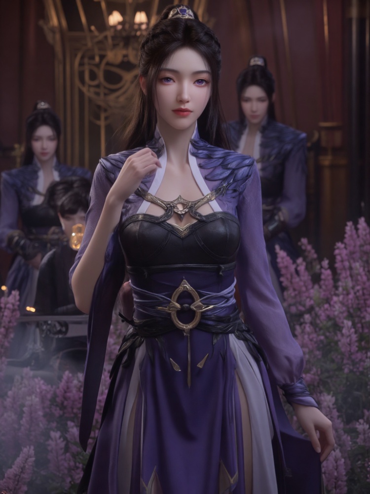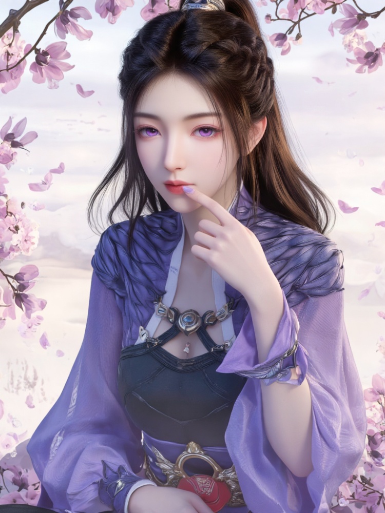 1girl,1girl,black hair,purple eyes,long Hair, brown hair,upper body,masterpiece ,bestquality,dress,braid hair bun,mouth evil,full body,smile,