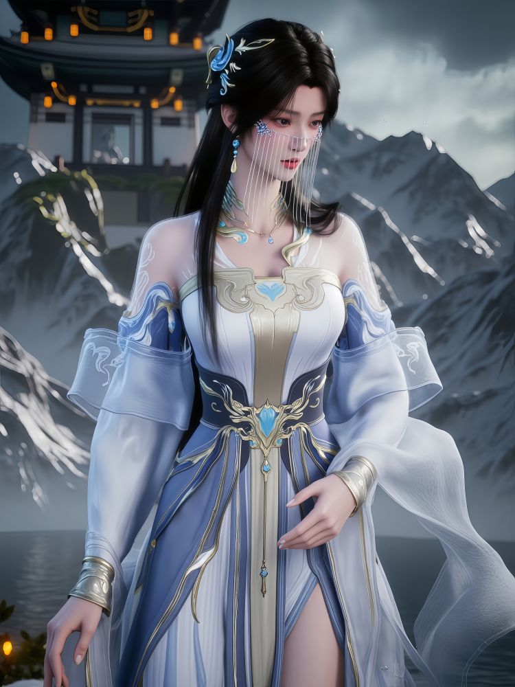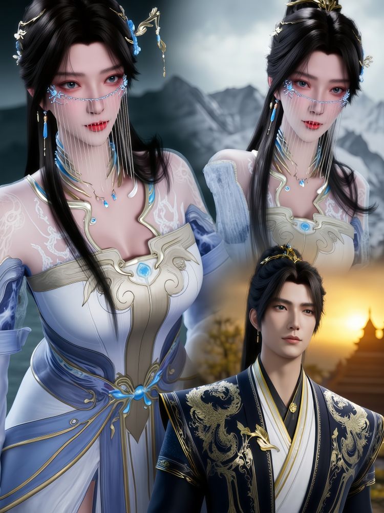 This is a set of digital art works with a strong ancient style of immortal heroes, presented in multiple dimensions with one male and one female character as the core. -Female characters: -Hairstyles and accessories: Long black hair that is shiny and shiny, either naturally flowing or delicately braided, paired with multiple sets of hair accessories. There are flower shaped hair accessories with blue and gold colors, embellished with transparent bead decorations, and gold fine chain decorations interspersed among them, showing luxury and delicacy; In the later stage, there were also veils with a large number of silver tassels, with exquisite patterns on them. The tassels swayed gently with the movements, adding a mysterious and elegant temperament. -Clothing: Dressed in a blue and white gradient ancient style long skirt, the style is elegant and dynamic, using a large amount of light and thin gauze fabric, with delicate white cloud patterns or similar dark embroidery on top. The clothing features rich details, with gold and blue decorative lines on the collar and cuffs, complex gold patterned decorations on the chest, and matching necklaces and earrings in the same color scheme. The earrings are a combination of blue beads and silver, showcasing a fairy like and luxurious overall. -Makeup: The makeup is exquisite. The eye shadow adopts a light pink color, which echoes the red lips. powder blusher is natural, highlighting the gentle and soft temperament. -Posture and Movement: There are various postures, such as looking down, standing sideways, and stretching arms. The movements show softness and agility, and the gauze fabric of the clothing also presents a natural and elegant feeling with the movements. -Jade Feet: In some scenes, one can see its jade feet, with delicate skin that complements the overall ethereal image. -Male role: -Hairstyle and hair accessories: Long hair tied up and fixed with a golden crown, the crown design is simple and elegant, highlighting a heroic spirit. -Clothing: Wearing an ancient style robe with black and gold stripes, embroidered with golden dragon patterns and other designs, showcasing nobility and majesty. The cutting of the clothing is neat, with a gold waistband decoration around the waist, creating a stable and atmospheric overall style. -Composition and shooting perspective: -The composition is diverse, including close-up, mid shot, panoramic, etc. Rich shooting angles, including overhead shots, capture characters from low angles, highlighting their height and fairy spirit; There are also flat shots that showcase the posture and clothing details of characters from different angles. -Facial expression: -Female characters' expressions may be gentle, slightly contemplative, or focused, while male characters' expressions tend to be calm and resolute, conveying their emotions and personality through their expressions. -Background and Environment: -The background style is varied, with steep mountain peaks covered in ice and snow, clear rock textures, and white snow; A classical architectural complex with a fairy like aura, elegant architectural style, and quaint colors; There is a shimmering water surface, with twinkling light spots on it, like a dream or illusion; There is also a courtyard with golden trees, filled with a serene beauty. The sky also presents in different ways, either gloomy and cloudy, or warm yellow under the sunset, adding different atmospheres to the picture. -Picture quality and style: -The picture quality is delicate, and the hair strands of the characters, the texture of the clothing, and the details of the background are all clearly visible. It belongs to the realistic style of ancient style fairy tale digital art, with proper handling of light and shadow effects, strong three-dimensional sense, harmonious color matching, creating a beautiful and layered visual effect. -Decoration and matching: -In addition to hair accessories and clothing decorations, overall matching also emphasizes the unity of color and style. Women's blue and white clothing contrasts with men's black and gold clothing, and through the integration of scene elements, hair accessories, clothing, and accessories also echo each other, showing the overall coordination and delicacy.