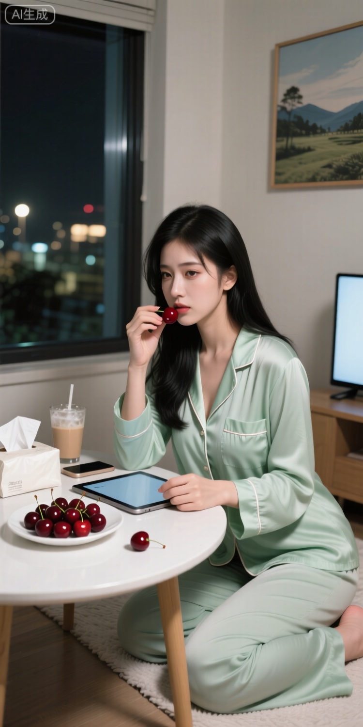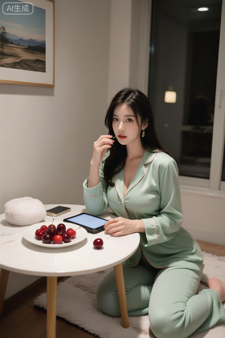 2.跪姿造型强化了画面的张力感,丝绒材质在光线下呈现细腻光泽。黑色手持物(疑似手机)为画面注入生活气息,墙面装饰画打破背景单调性,深V领设计与散落黑发展现出兼具优雅与松弛感的女性气质。