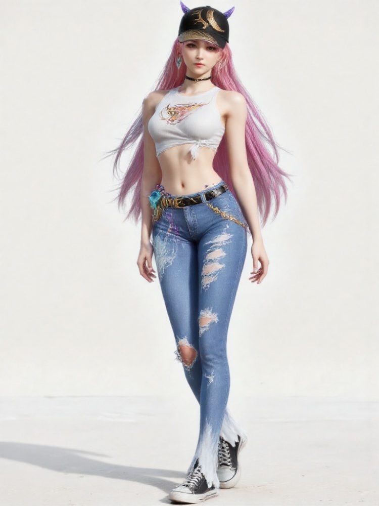 1girl,tied shirt,denim,**** top,torn clothes,midriff,choker,sleeveless,horns,earrings,white shirt,jewelry,bare shoulders,long hair,torn jeans,belt,canvas shoes,jeans,baseball cap,black headwear,crop top,multicolored hair,streaked hair,weapon,