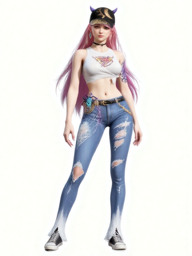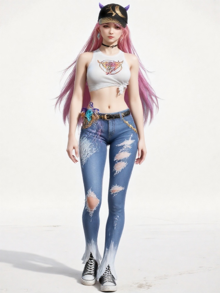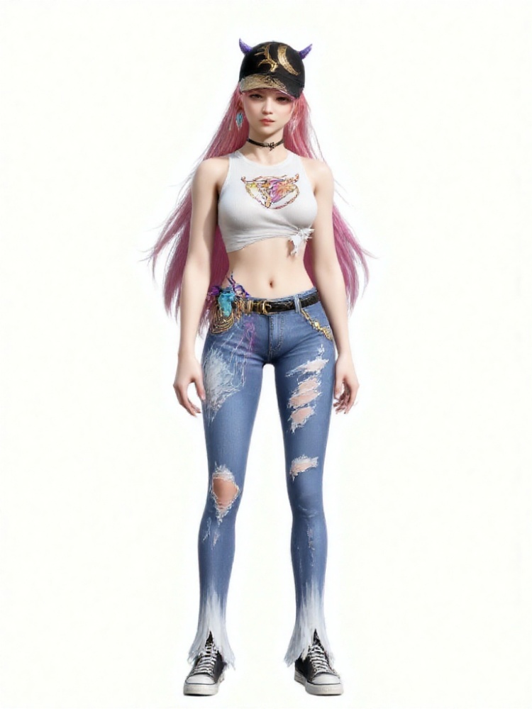3D,1girl,tied shirt,denim,**** top,torn clothes,midriff,choker,sleeveless,horns,earrings,white shirt,jewelry,bare shoulders,long hair,torn jeans,belt,canvas shoes,jeans,baseball cap,black headwear,crop top,multicolored hair,streaked hair,Neon lights, streets, cyberpunk, ,katana,
