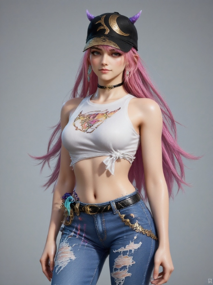 3D,1girl,tied shirt,denim,**** top,torn clothes,midriff,choker,sleeveless,horns,earrings,white shirt,jewelry,bare shoulders,long hair,torn jeans,belt,canvas shoes,jeans,baseball cap,black headwear,crop top,multicolored hair,streaked hair,Neon lights, streets, cyberpunk, ,katana,