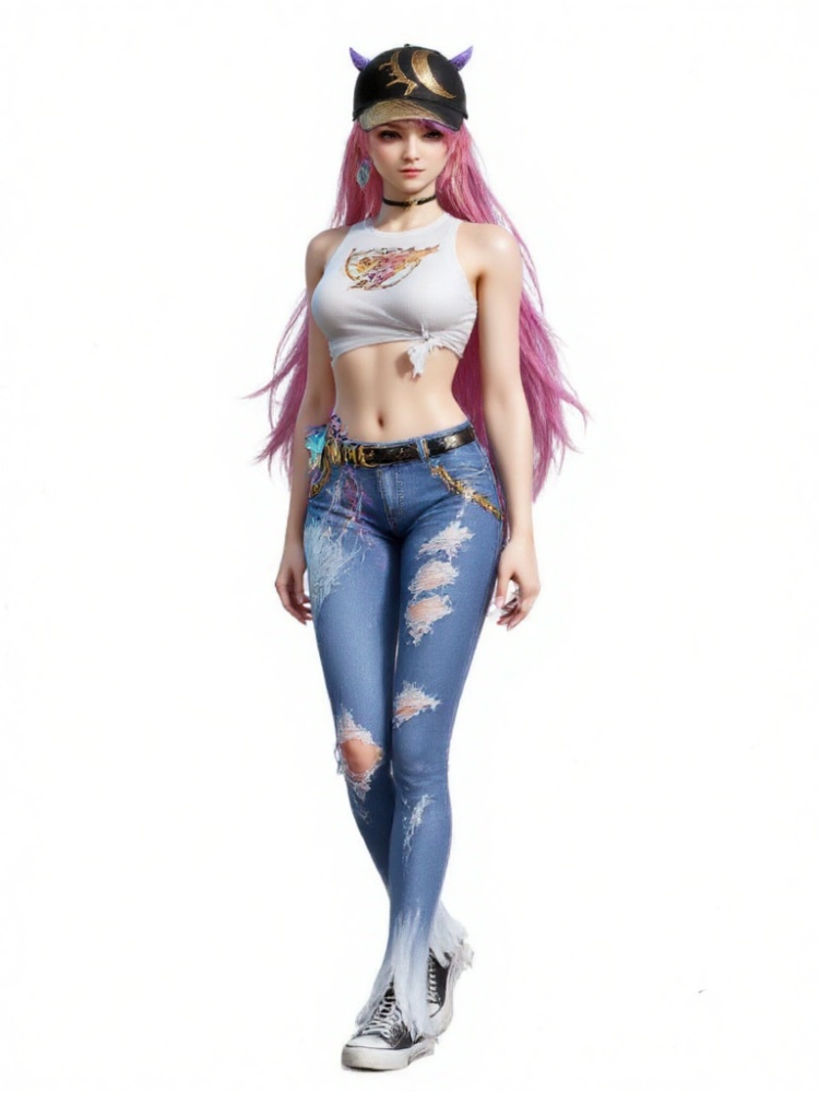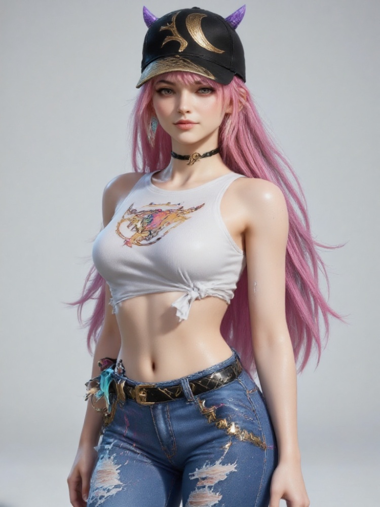1girl,tied shirt,denim,**** top,torn clothes,midriff,choker,sleeveless,horns,earrings,white shirt,jewelry,bare shoulders,long hair,torn jeans,belt,canvas shoes,jeans,baseball cap,black headwear,crop top,multicolored hair,streaked hair采样算法Samplereuler