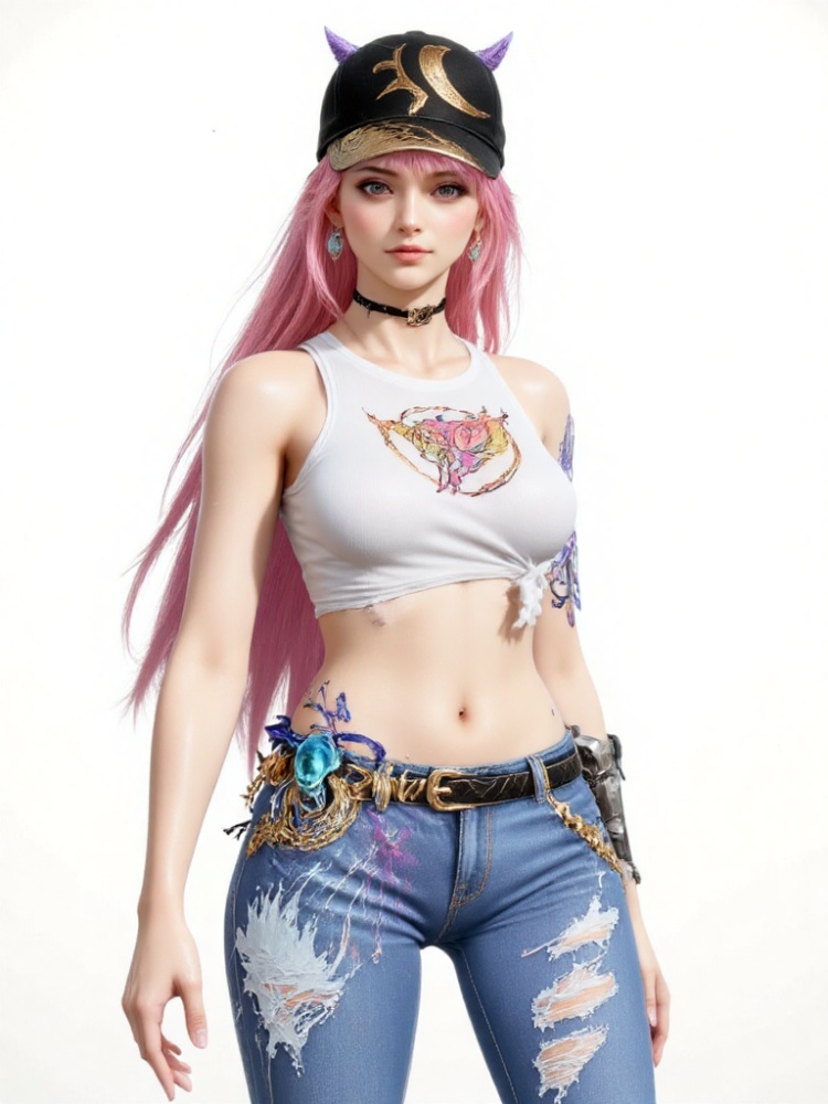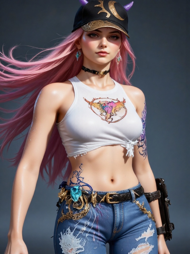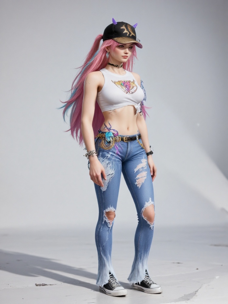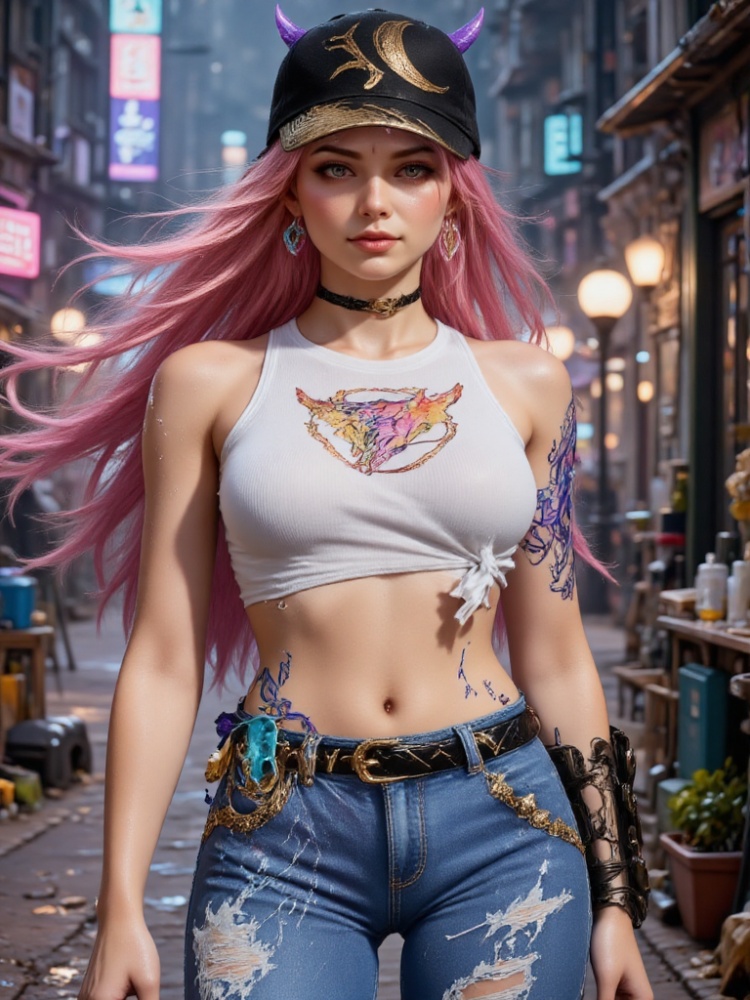 3D,1girl,tied shirt,denim,**** top,torn clothes,midriff,choker,sleeveless,horns,earrings,white shirt,jewelry,bare shoulders,long hair,torn jeans,belt,canvas shoes,jeans,baseball cap,black headwear,crop top,multicolored hair,streaked hair,Neon lights, streets, cyberpunk, ,katana,