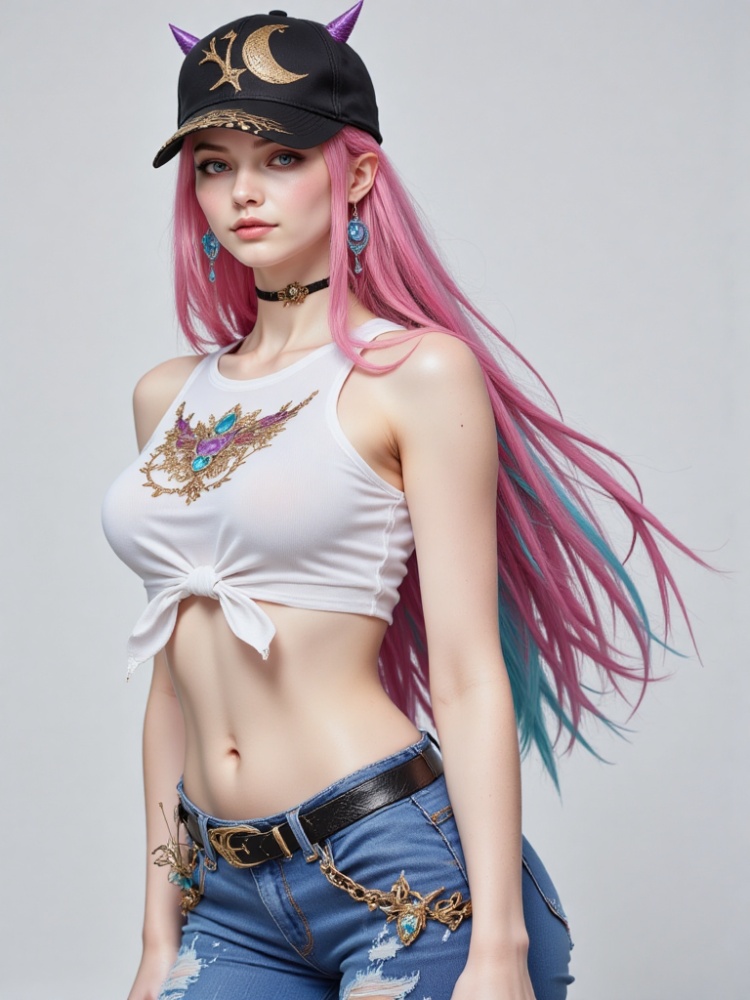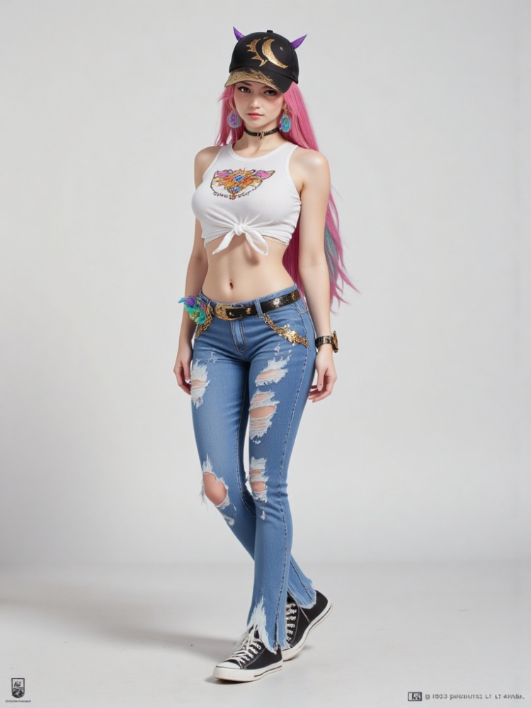 3D,1girl,tied shirt,denim,**** top,torn clothes,midriff,choker,sleeveless,horns,earrings,white shirt,jewelry,bare shoulders,long hair,torn jeans,belt,canvas shoes,jeans,baseball cap,black headwear,crop top,multicolored hair,streaked hair,Neon lights, streets, cyberpunk, ,katana,