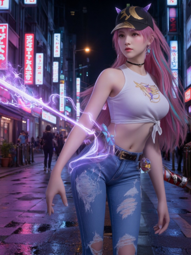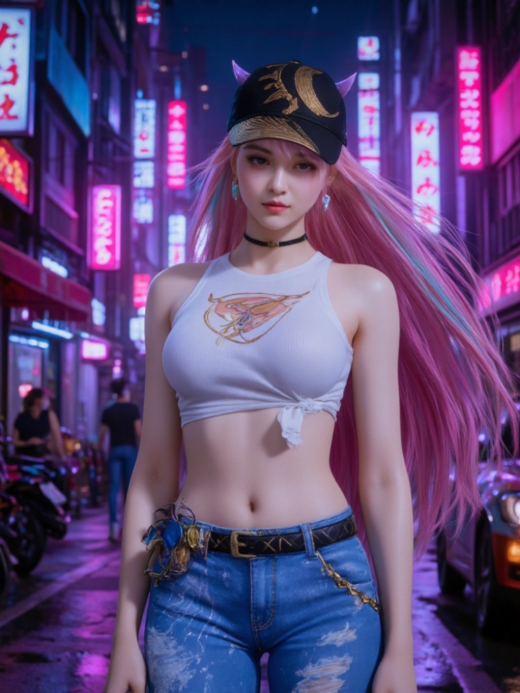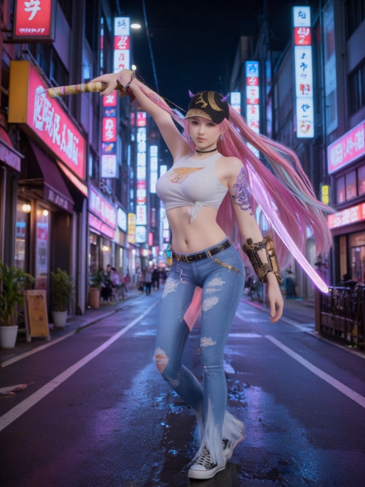 3D,1girl,tied shirt,denim,**** top,torn clothes,midriff,choker,sleeveless,horns,earrings,white shirt,jewelry,bare shoulders,long hair,torn jeans,belt,canvas shoes,jeans,baseball cap,black headwear,crop top,multicolored hair,streaked hair,Neon lights, streets, cyberpunk, ,katana,