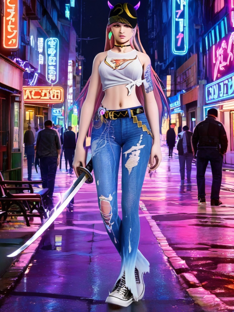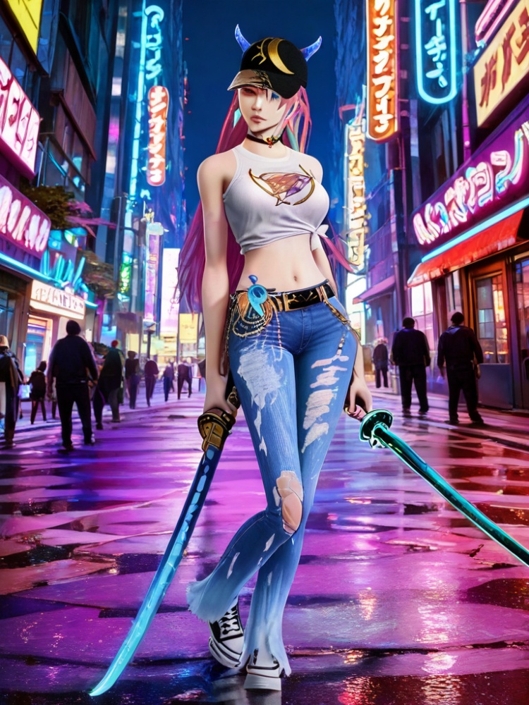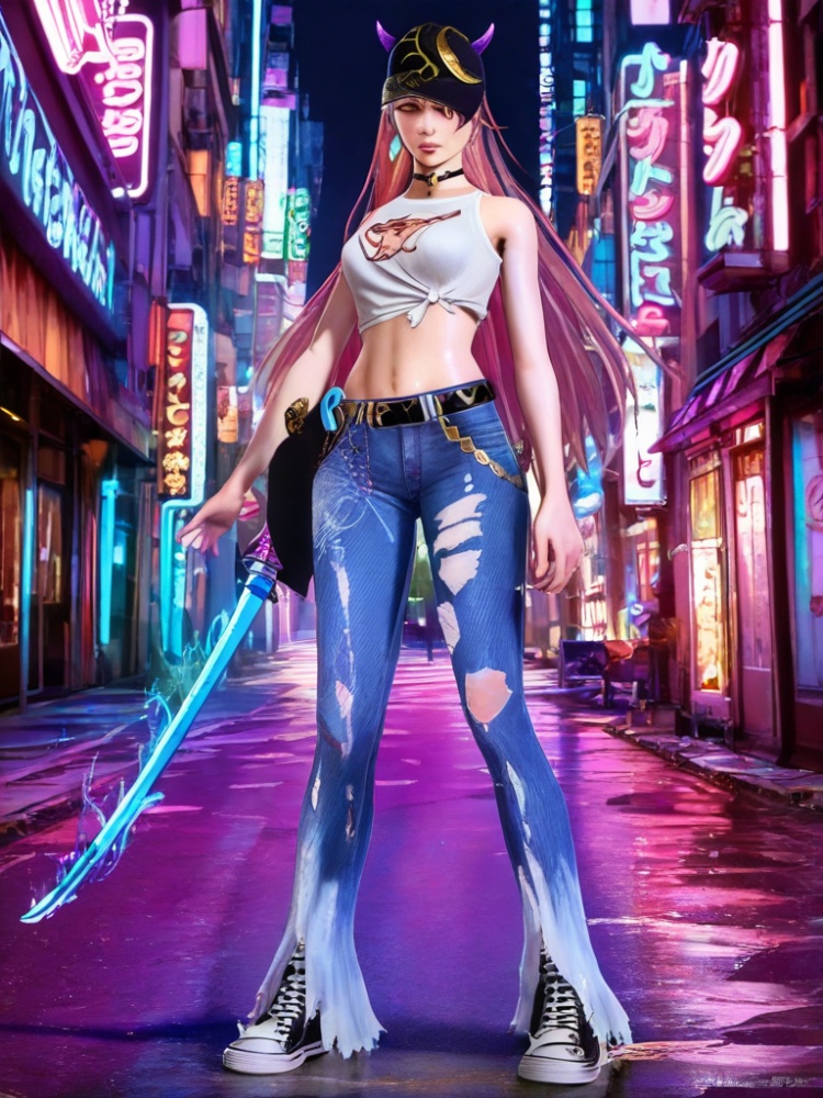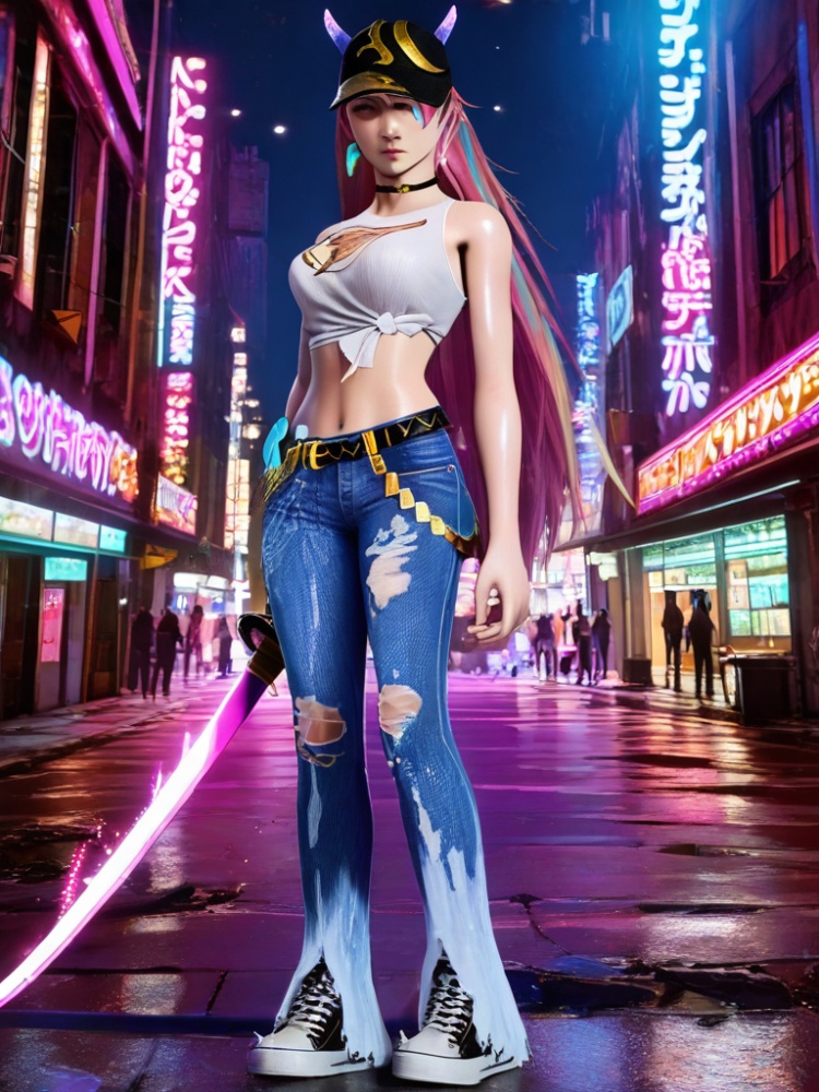 3D,1girl,tied shirt,denim,**** top,torn clothes,midriff,choker,sleeveless,horns,earrings,white shirt,jewelry,bare shoulders,long hair,torn jeans,belt,canvas shoes,jeans,baseball cap,black headwear,crop top,multicolored hair,streaked hair,Neon lights, streets, cyberpunk, ,katana,