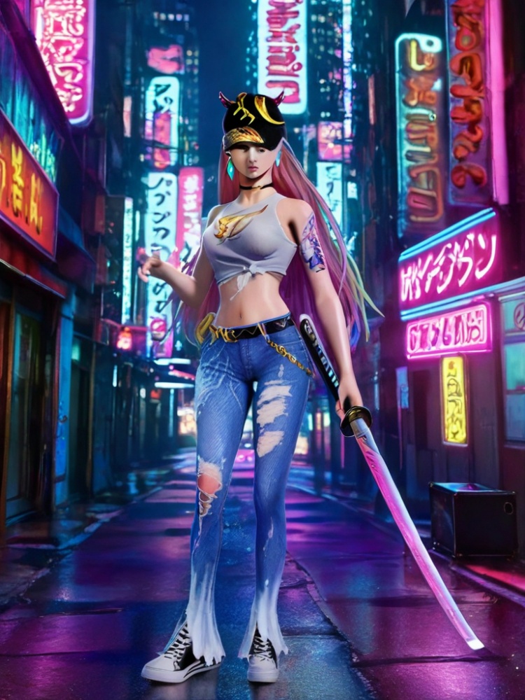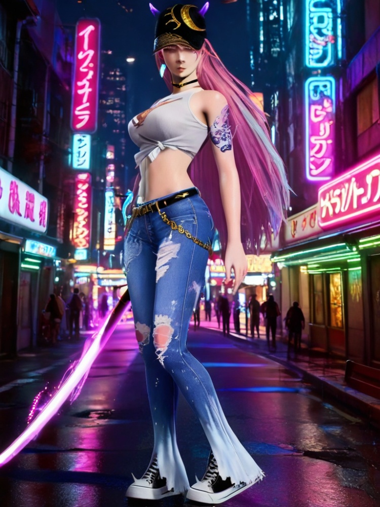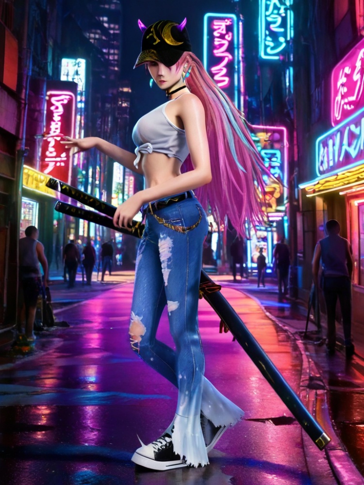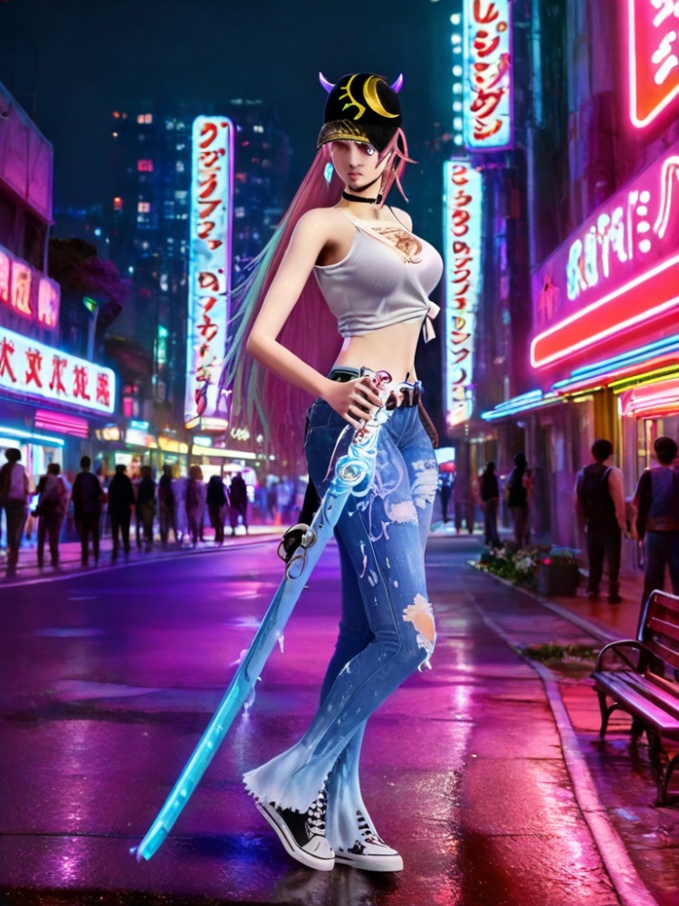 3D,1girl,tied shirt,denim,**** top,torn clothes,midriff,choker,sleeveless,horns,earrings,white shirt,jewelry,bare shoulders,long hair,torn jeans,belt,canvas shoes,jeans,baseball cap,black headwear,crop top,multicolored hair,streaked hair,Neon lights, streets, cyberpunk, ,katana,