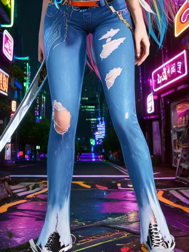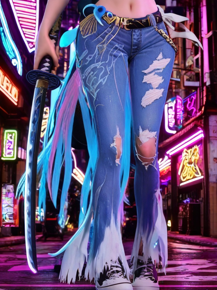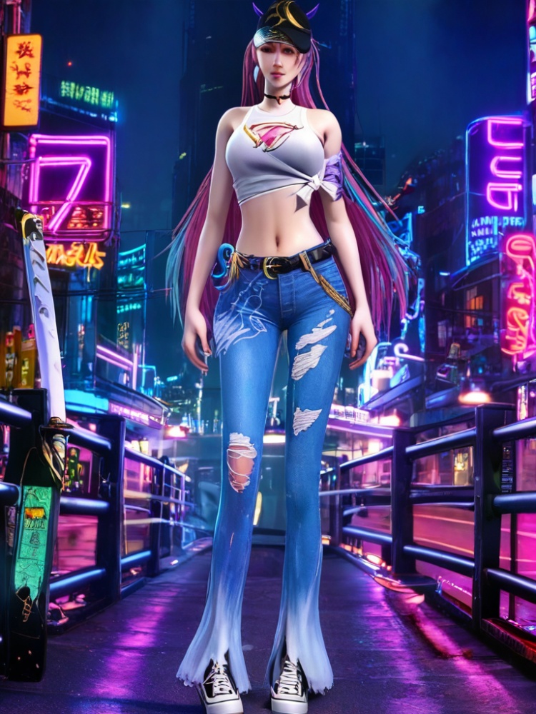 1girl,tied shirt,denim,**** top,torn clothes,midriff,choker,sleeveless,horns,earrings,white shirt,jewelry,bare shoulders,long hair,torn jeans,belt,canvas shoes,jeans,baseball cap,black headwear,crop top,multicolored hair,streaked hair,Neon lights, streets, cyberpunk, ,weapon,Samurai sword,katana,