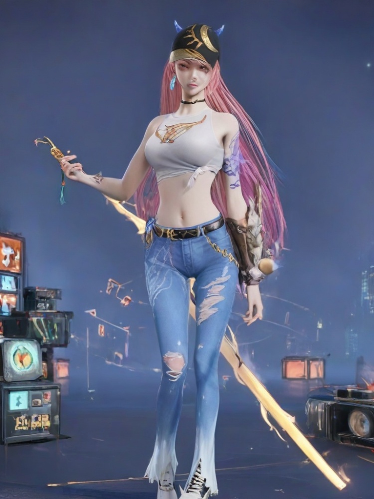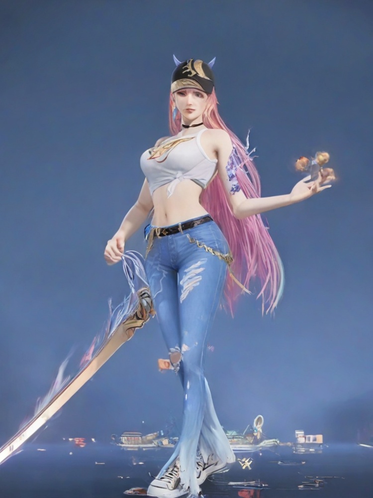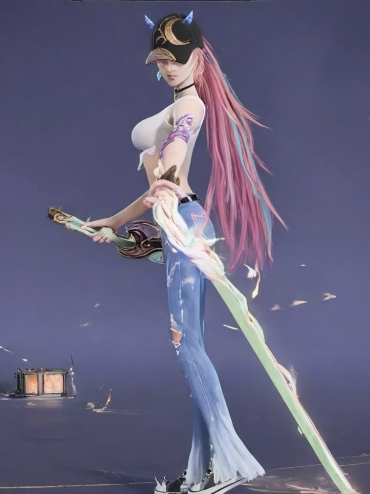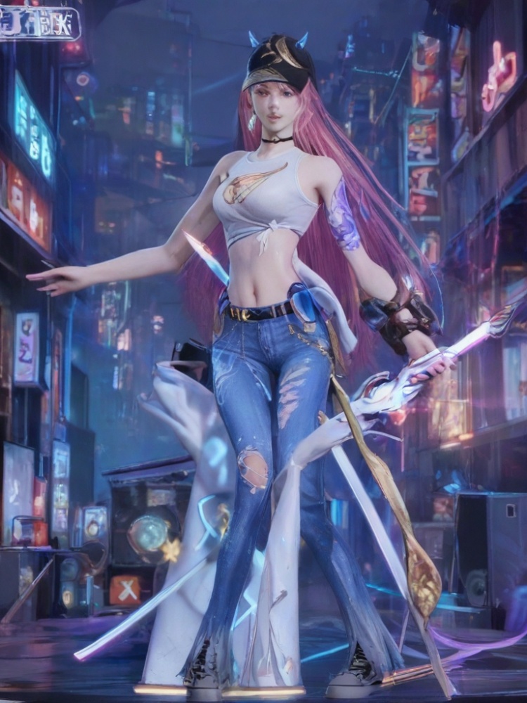 1girl,tied shirt,denim,tan k top,torn clothes,midriff,choker,sleeveless,horns,earrings,white shirt,jewelry,bare shoulders,long hair,torn jeans,belt,canvas shoes,jeans,baseball cap,black headwear,crop top,multicolored hair,streaked hair,Neon lights, streets, cyberpunk, weapons,weapon,Samurai sword,katana,