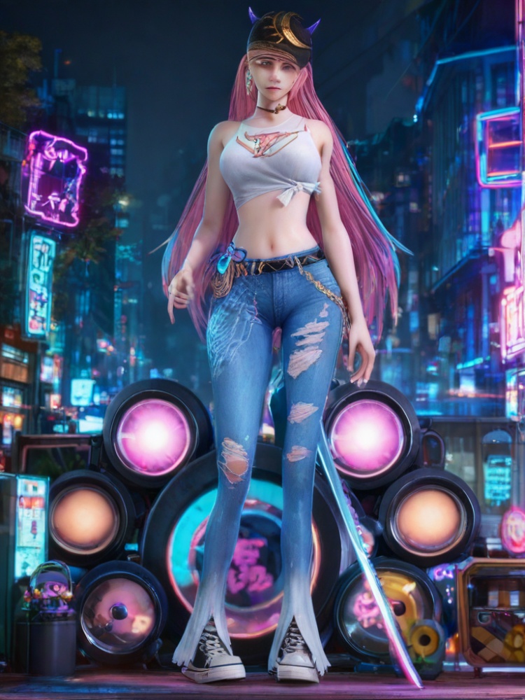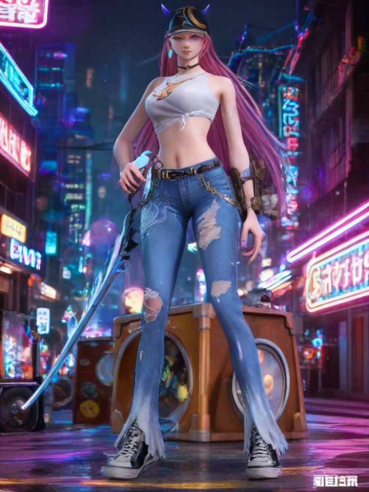 1girl,tied shirt,denim,tan k top,torn clothes,midriff,choker,sleeveless,horns,earrings,white shirt,jewelry,bare shoulders,long hair,torn jeans,belt,canvas shoes,jeans,baseball cap,black headwear,crop top,multicolored hair,streaked hair,Neon lights, streets, cyberpunk, weapons,weapon,Samurai sword,katana,