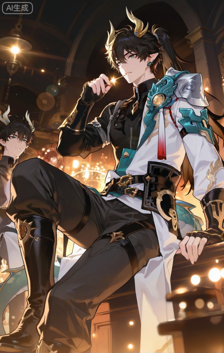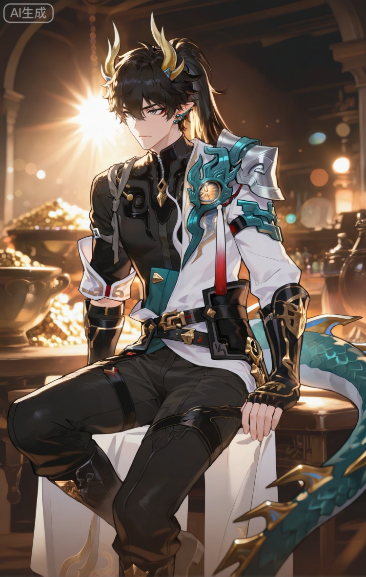 (1boy (dan heng (permansor terrae) (honkai: star rail)),dan_heng,Gray eyes,leg loops,Green Dragon Tail,Black tight fitting clothes,dragon horns,fingerless gloves,pants,belt,pointy ears,horns,boots,earrings,ponytail,jewelry,hair between eyes,black hair,shirt,bangs,long hai