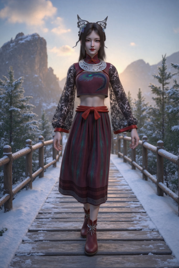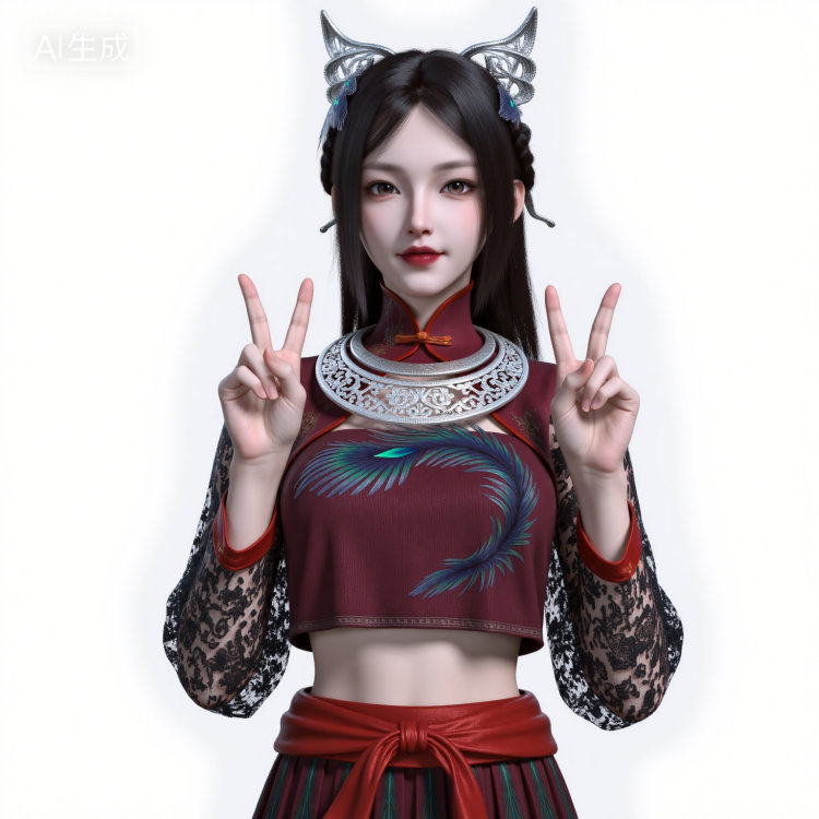 full crimson lips, fair luminous skin, wearing cropped burgundy cheongsam with peacock feather embroidery, black lace sleeves, matching burgundy pleated midi-length skirt with vertical feather patterns, wide red satin sash at waist, wine-red ankle boots with silver vine embellishments, intricate silver neck rings,