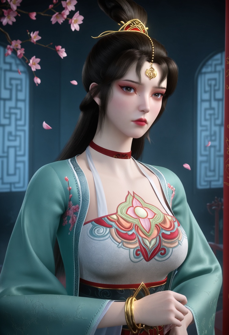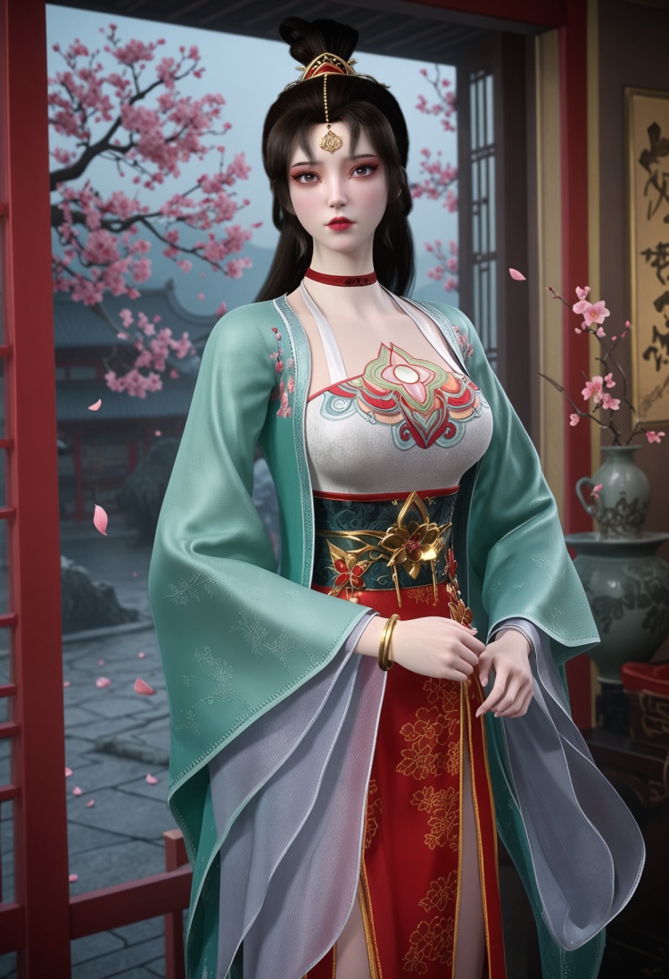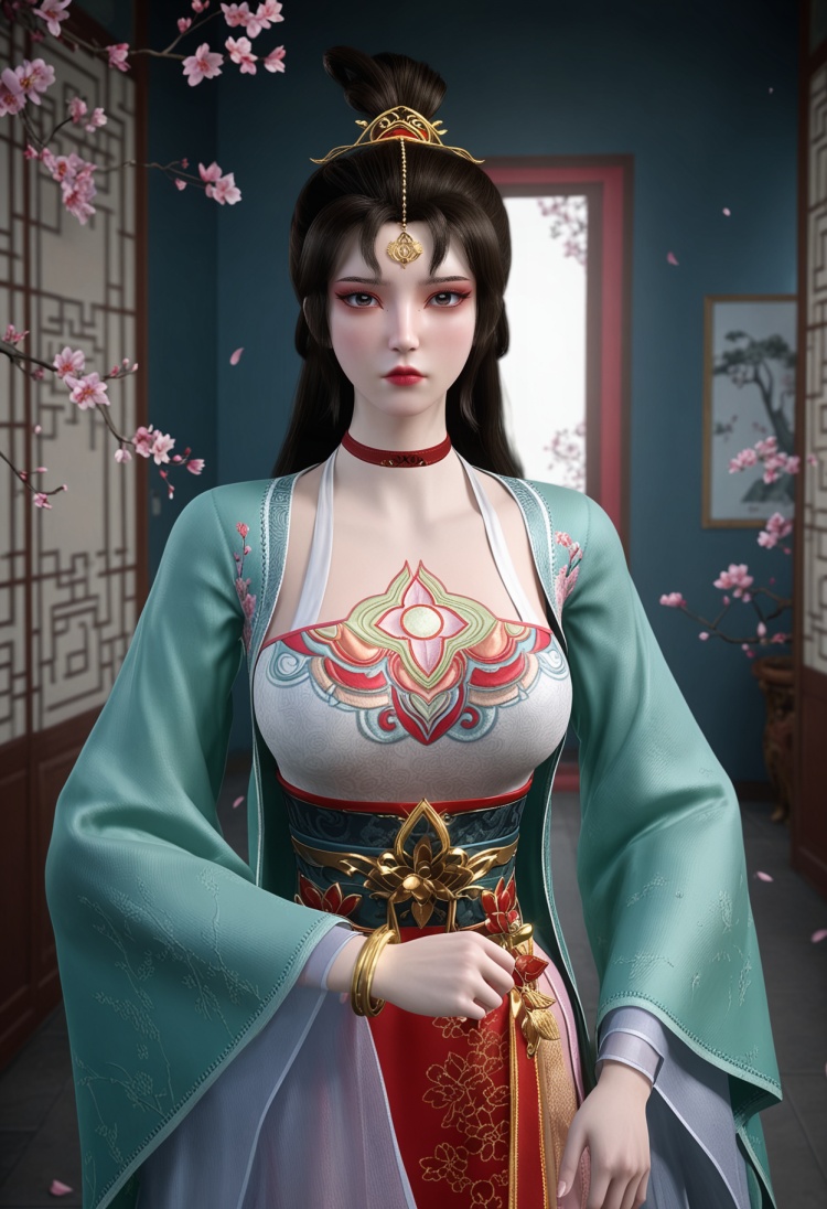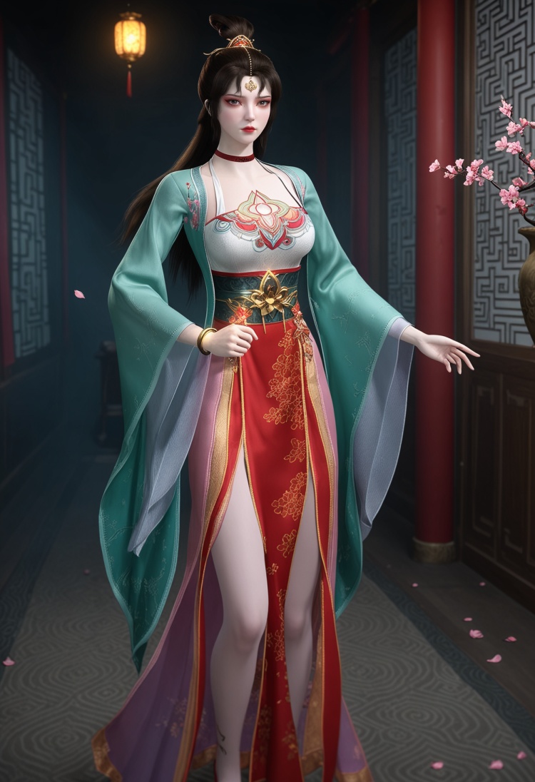 q1528437228,1girl,solo,black hair,long hair,choker,red choker,hair ornament,dress,chinese clothes,long sleeves,jewelry,forehead mark,bracelet,wide sleeves,hair bun,brown hair,mole under eye,brown eyes,eyeshadow,red footwear,