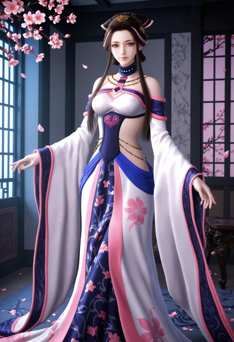 q1528437228,1girl,solo,long hair,black hair,jewelry,bare shoulders,necklace,hair ornament,brown hair,dress,sidelocks,wide sleeves,long sleeves,choker,hair bun,brown eyes,detached sleeves,grey eyes,blue eyes,