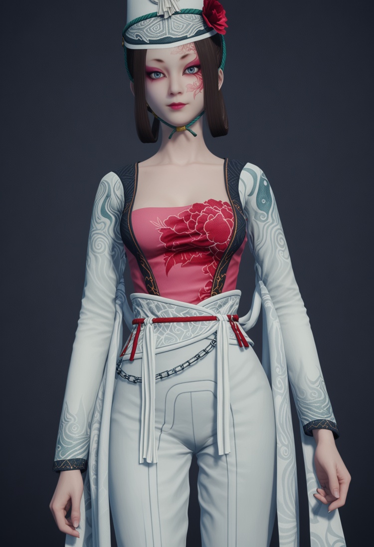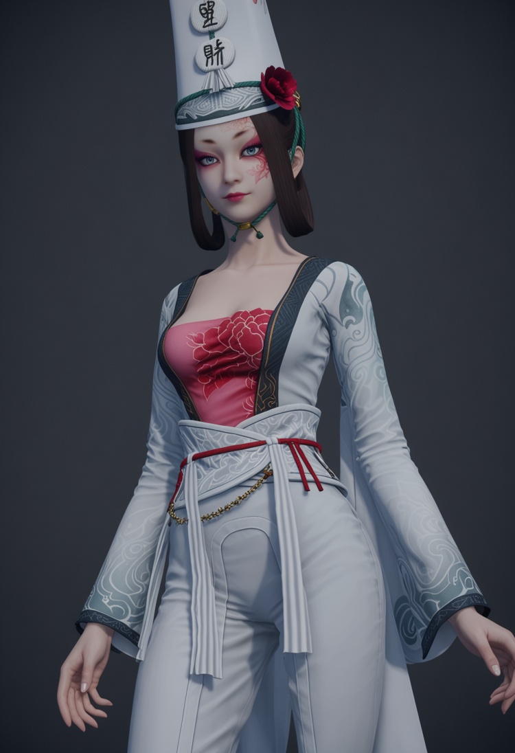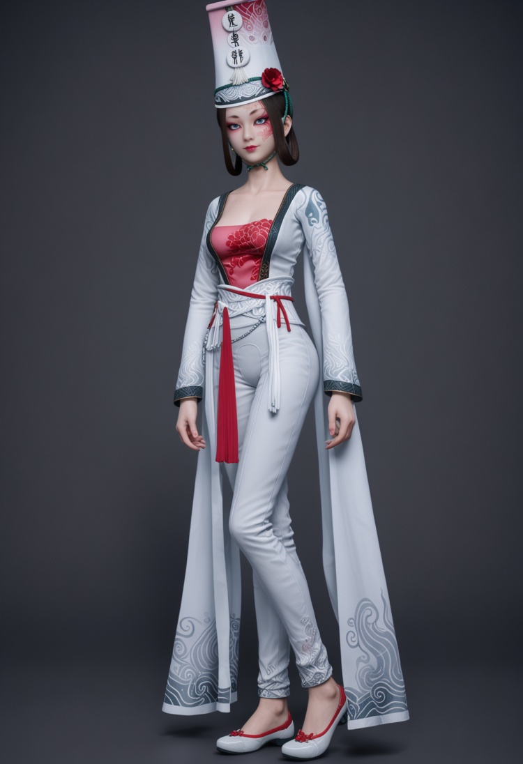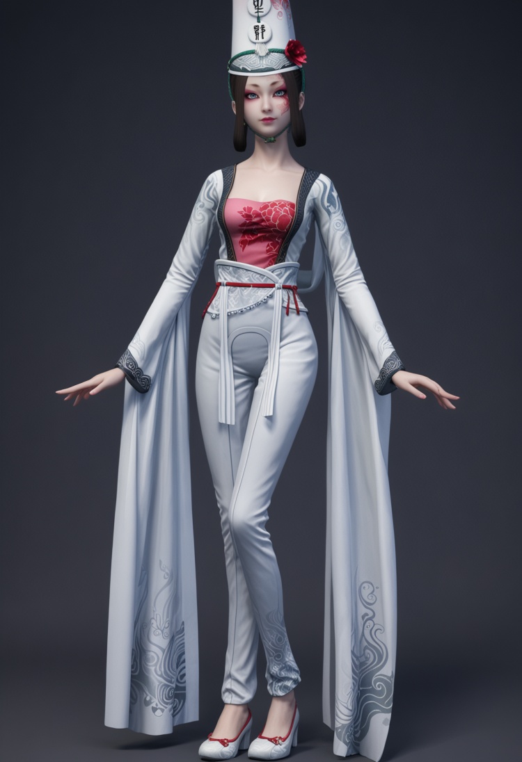 <lora:YQ_pony_baiwuchang_changxuanlin_V4:0.8>,q1528437228,1girl,solo,black hair,hat,hair flower,makeup,chinese clothes,dress,hair ornament,long sleeves,grey eyes,blue eyes,facepaint,hair rings,eyeshadow,pants,jewelry,headwear,long hair,facial mark,short hair,brown hair,shoes,