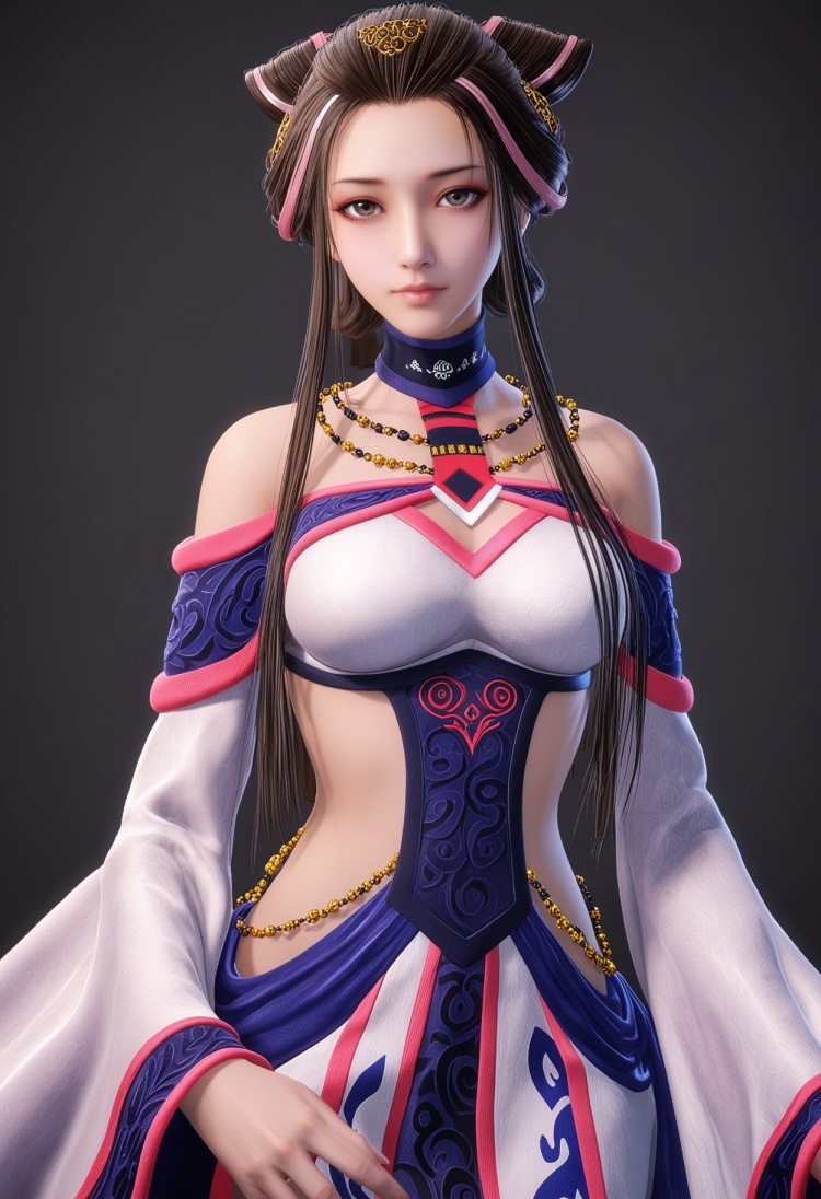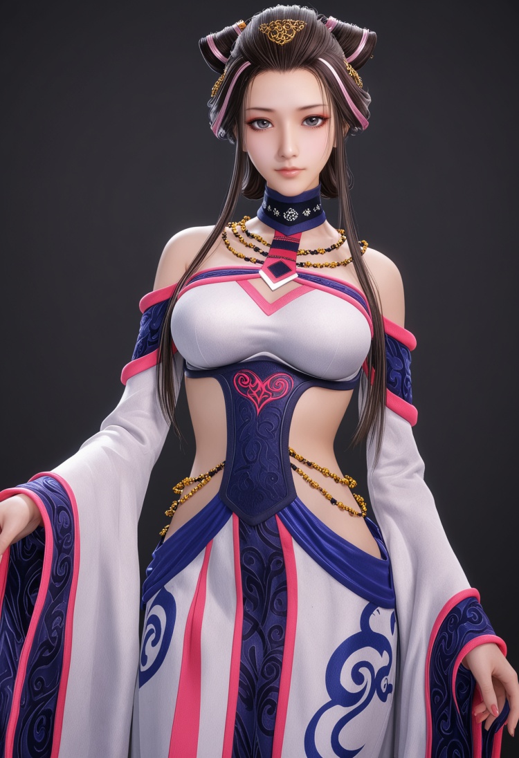 <lora:YQ_pony_xiangfuren_V4:0.8>,q1528437228,1girl,solo,long hair,black hair,jewelry,bare shoulders,necklace,hair ornament,brown hair,dress,sidelocks,wide sleeves,long sleeves,choker,hair bun,brown eyes,detached sleeves,grey eyes,blue eyes,
