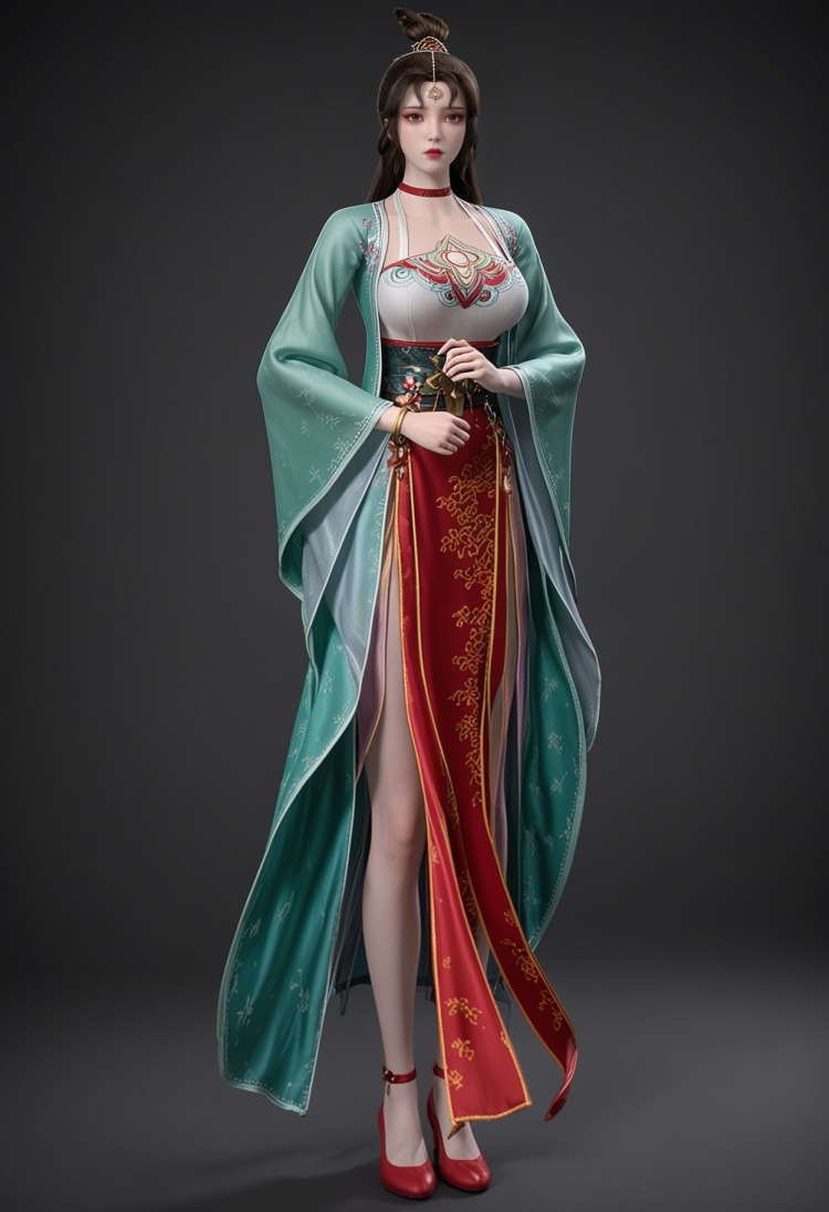 <lora:YQ_pony_yunmo_V4:0.8>,q1528437228,1girl,solo,black hair,long hair,choker,red choker,hair ornament,dress,chinese clothes,long sleeves,jewelry,forehead mark,bracelet,wide sleeves,hair bun,brown hair,mole under eye,brown eyes,eyeshadow,red footwear,