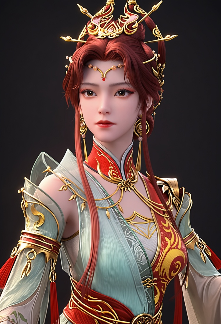 <lora:YQ_pony_zhenxianyingling_V4:0.8>,q1528437228,1girl,solo,jewelry,earrings,hair ornament,brown hair,chinese clothes,dress,hair bun,red hair,brown eyes,long hair,long sleeves,forehead mark,detached sleeves,sash,