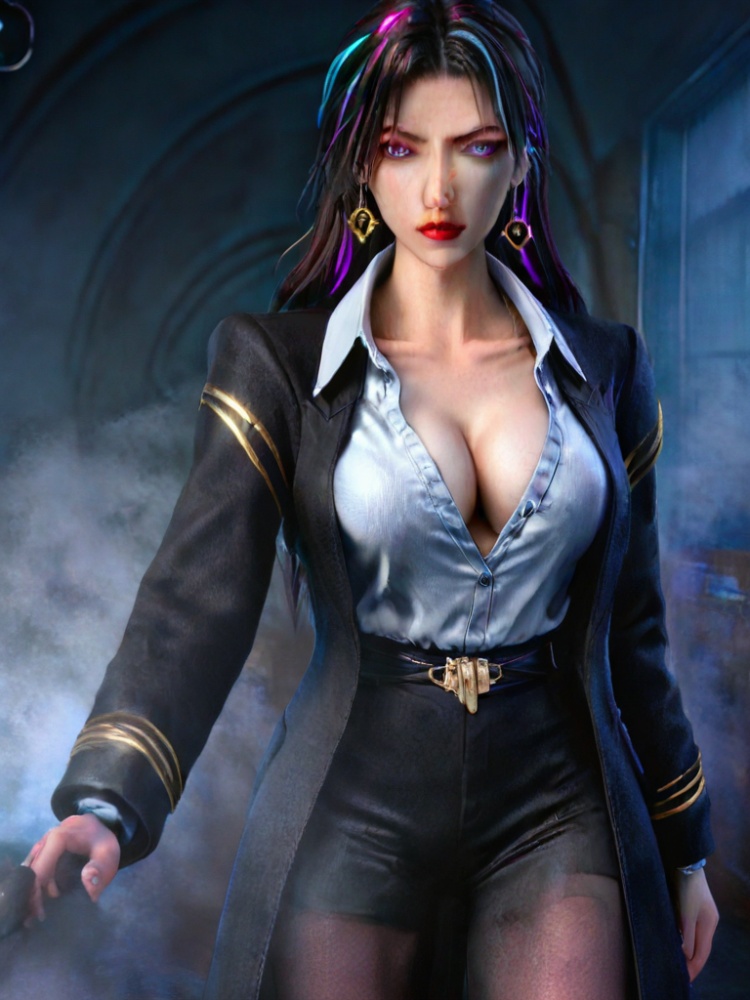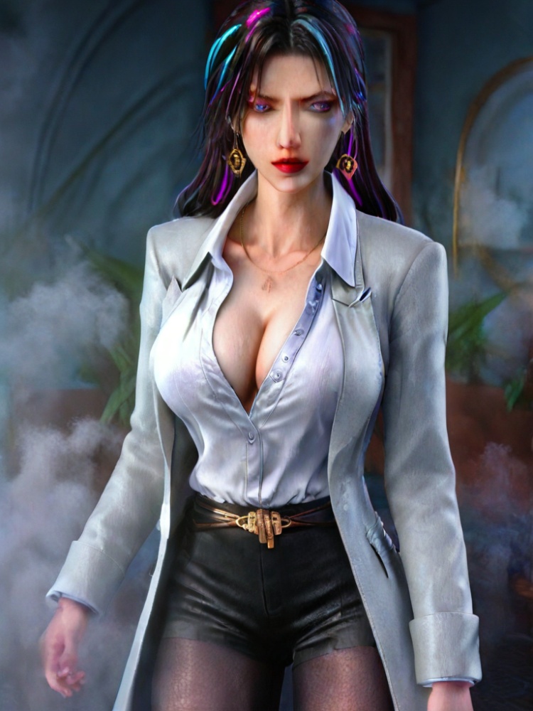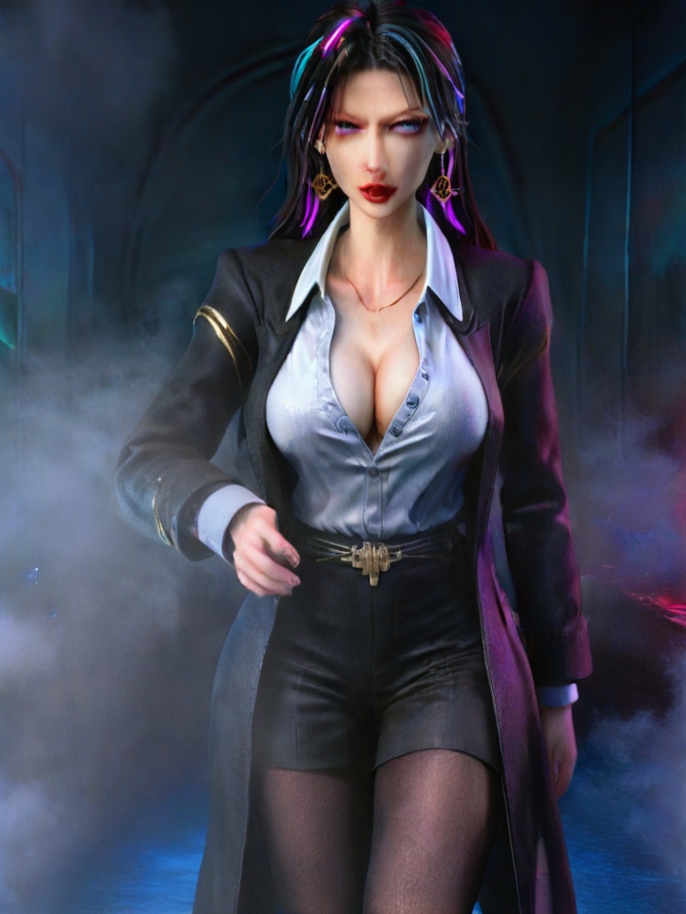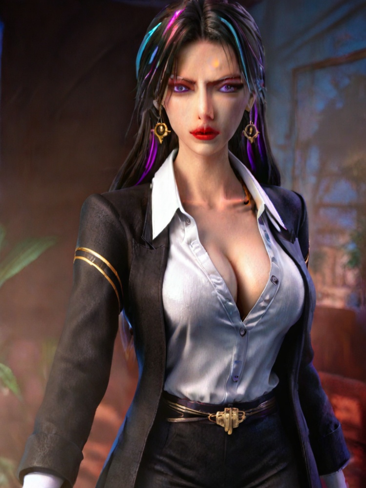 3D,1girl,office lady,multicolored hair,eyelashes,suit,partially unbuttoned,dress shirt,purple eyes,lipstick,open clothes,black pantyhose,coat,belt,red lips,black pants,collarbone,cleavage,large breasts,collared shirt streaked hair,portrait,realistic,black hair,blue eyes,jewelry,