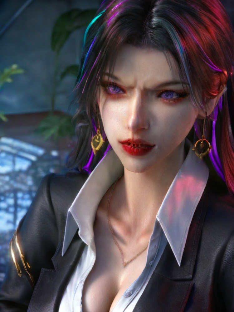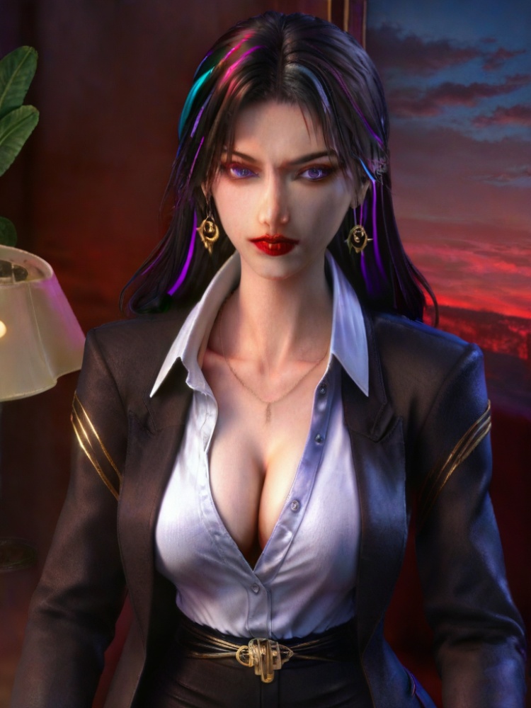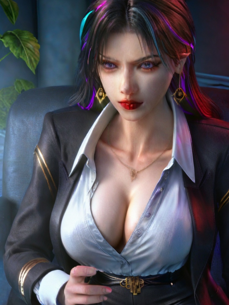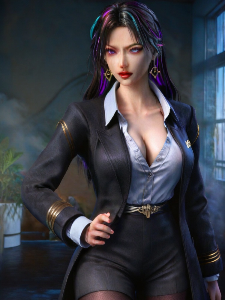 3D,1girl,office lady,multicolored hair,eyelashes,suit,partially unbuttoned,dress shirt,purple eyes,lipstick,open clothes,black pantyhose,coat,belt,red lips,black pants,collarbone,cleavage,large breasts,collared shirt streaked hair,portrait,realistic,black hair,blue eyes,jewelry,