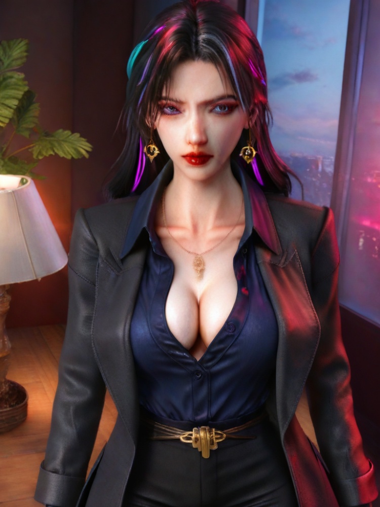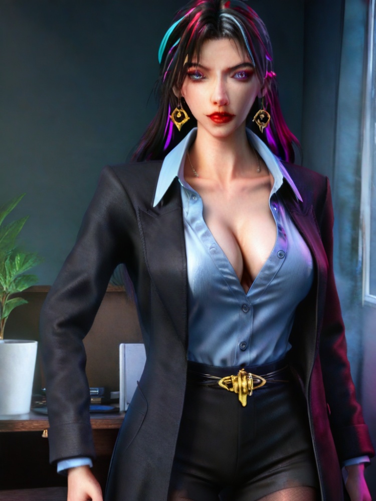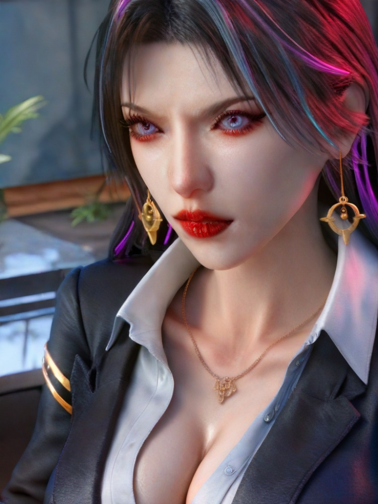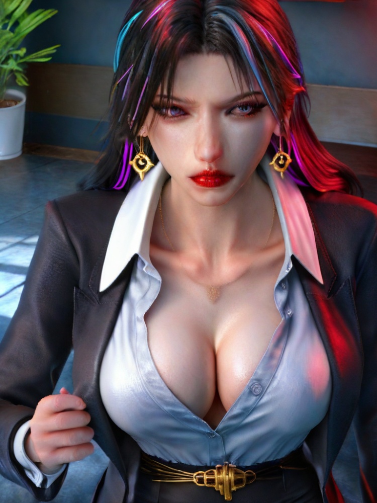 3D,1girl,office lady,multicolored hair,eyelashes,suit,partially unbuttoned,dress shirt,purple eyes,lipstick,open clothes,black pantyhose,coat,belt,red lips,black pants,collarbone,cleavage,large breasts,collared shirt streaked hair,portrait,realistic,black hair,blue eyes,jewelry,