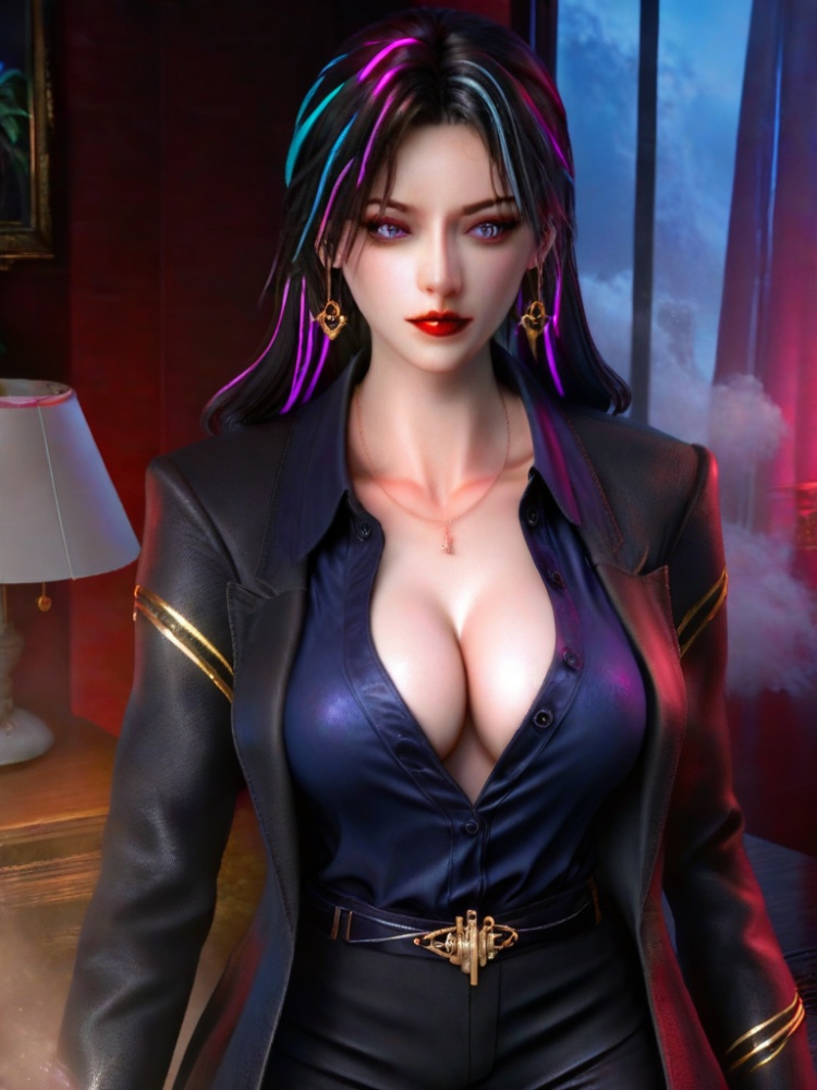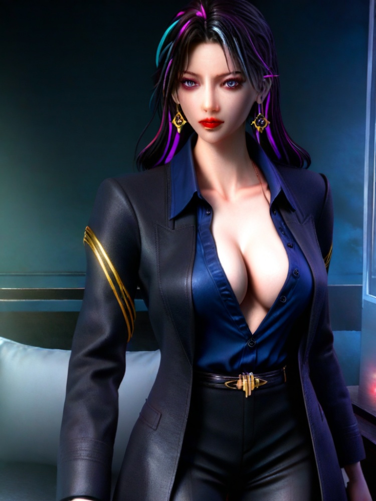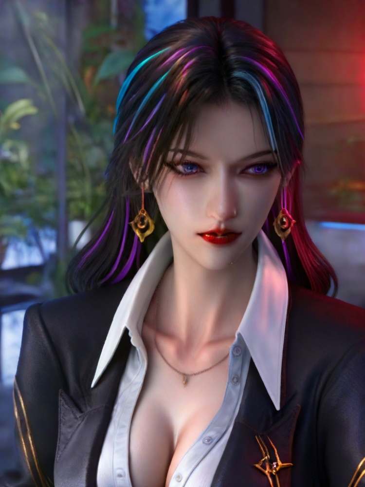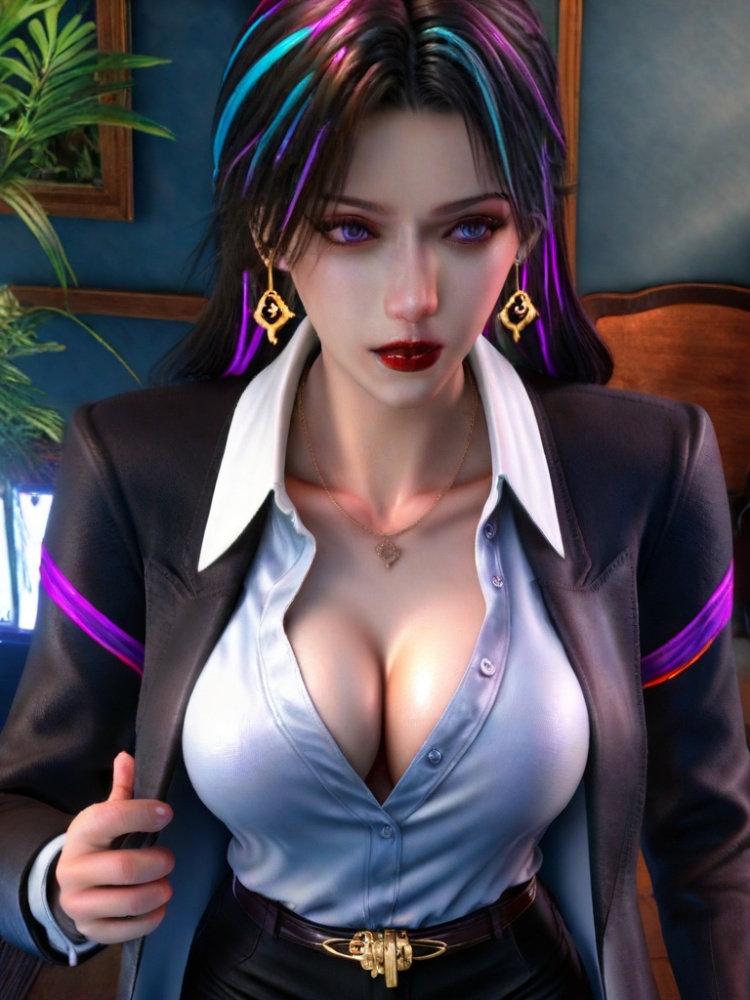 3D,1girl,office lady,multicolored hair,eyelashes,suit,partially unbuttoned,dress shirt,purple eyes,lipstick,open clothes,black pantyhose,coat,belt,red lips,black pants,collarbone,cleavage,large breasts,collared shirt streaked hair,portrait,realistic,black hair,blue eyes,jewelry,