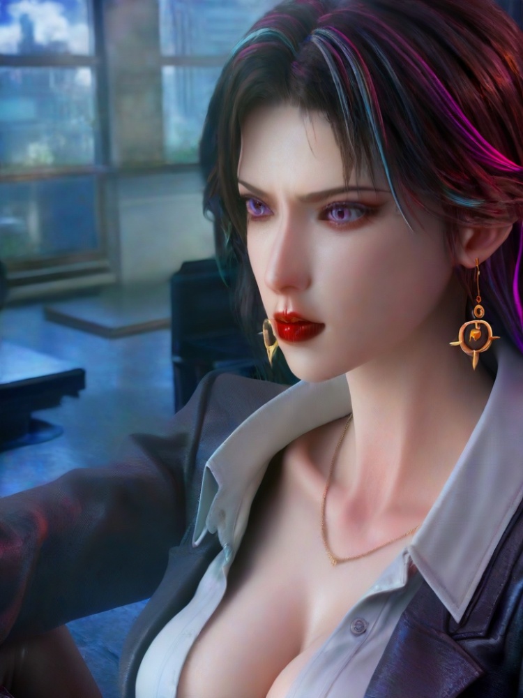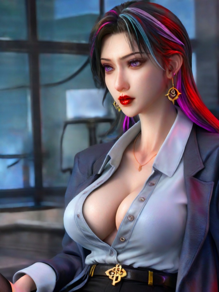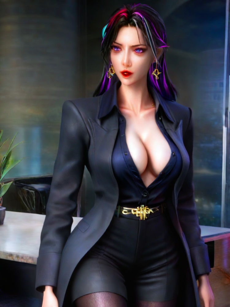 3D,1girl,office lady,multicolored hair,eyelashes,suit,partially unbuttoned,dress shirt,purple eyes,lipstick,open clothes,black pantyhose,coat,belt,red lips,black pants,collarbone,cleavage,large breasts,collared shirt streaked hair,portrait,realistic,black hair,blue eyes,jewelry,