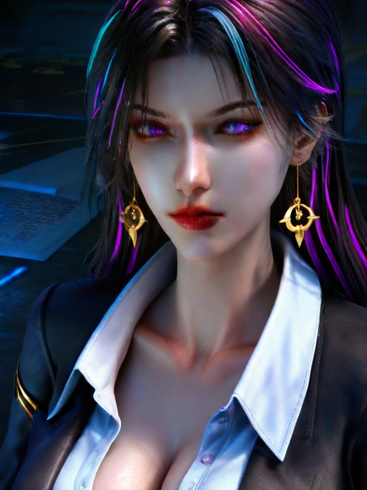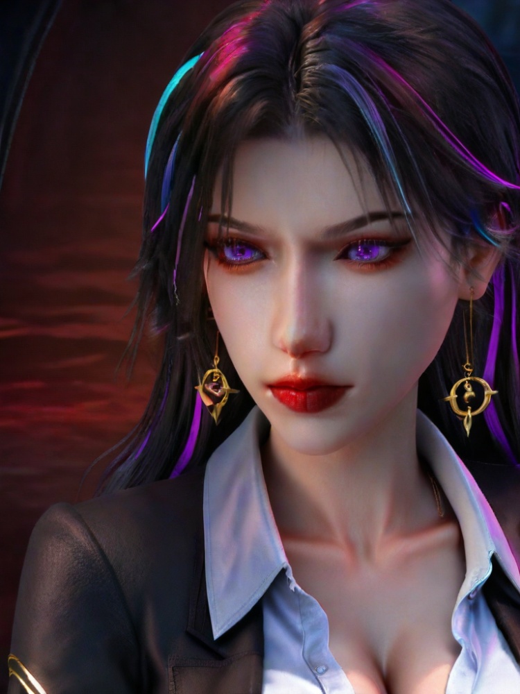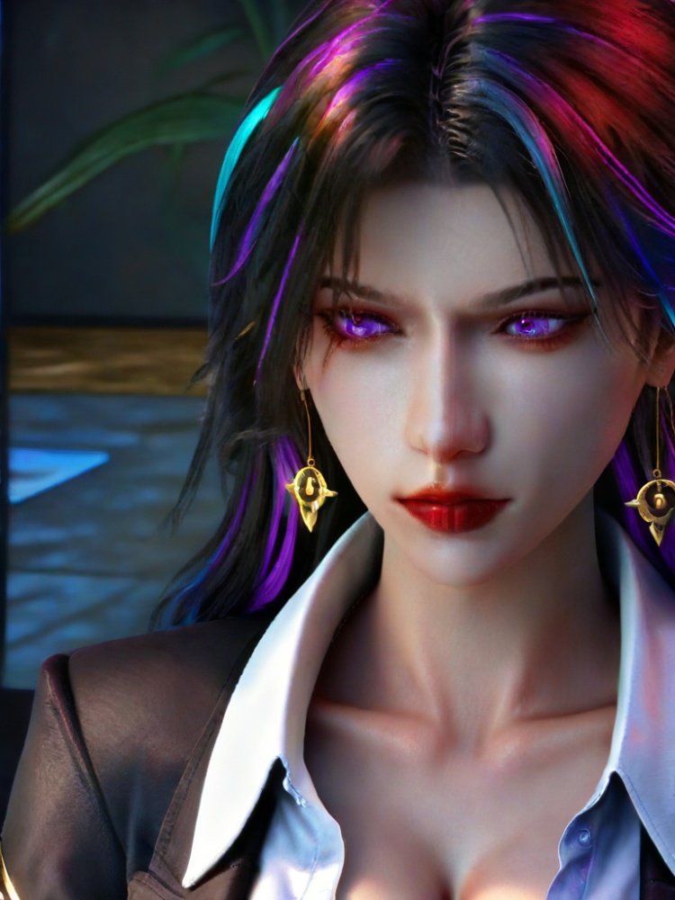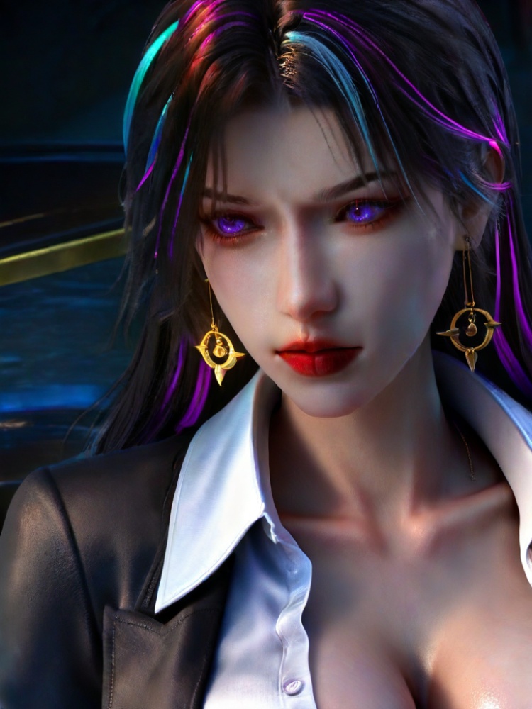 3D,1girl,office lady,multicolored hair,eyelashes,suit,partially unbuttoned,dress shirt,purple eyes,lipstick,open clothes,black pantyhose,coat,belt,red lips,black pants,collarbone,cleavage,large breasts,collared shirt streaked hair,portrait,realistic,black hair,blue eyes,jewelry,