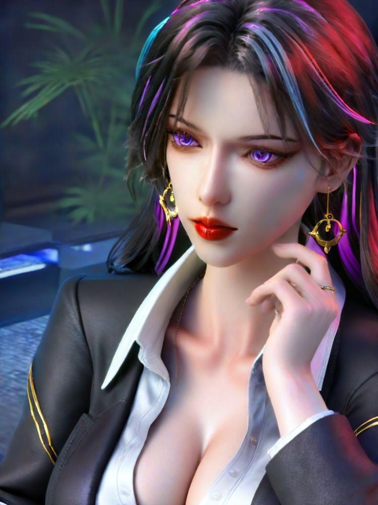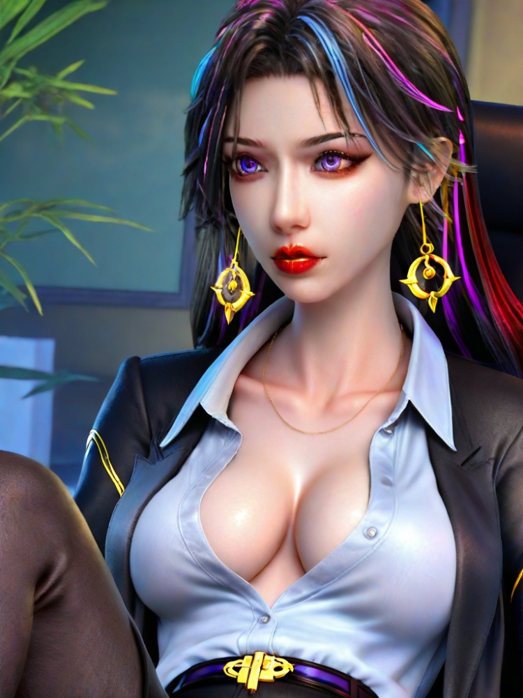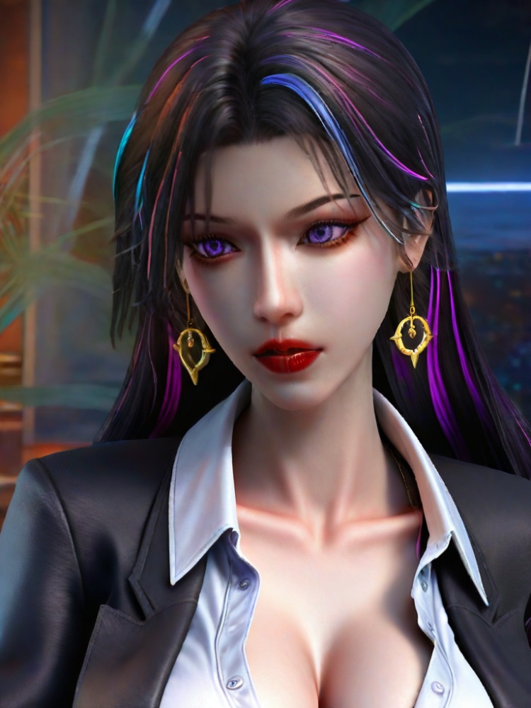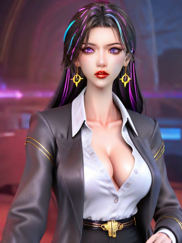 3D,1girl,office lady,multicolored hair,eyelashes,suit,partially unbuttoned,dress shirt,purple eyes,lipstick,open clothes,black pantyhose,coat,belt,red lips,black pants,collarbone,cleavage,large breasts,collared shirt streaked hair,portrait,realistic,black hair,blue eyes,jewelry,